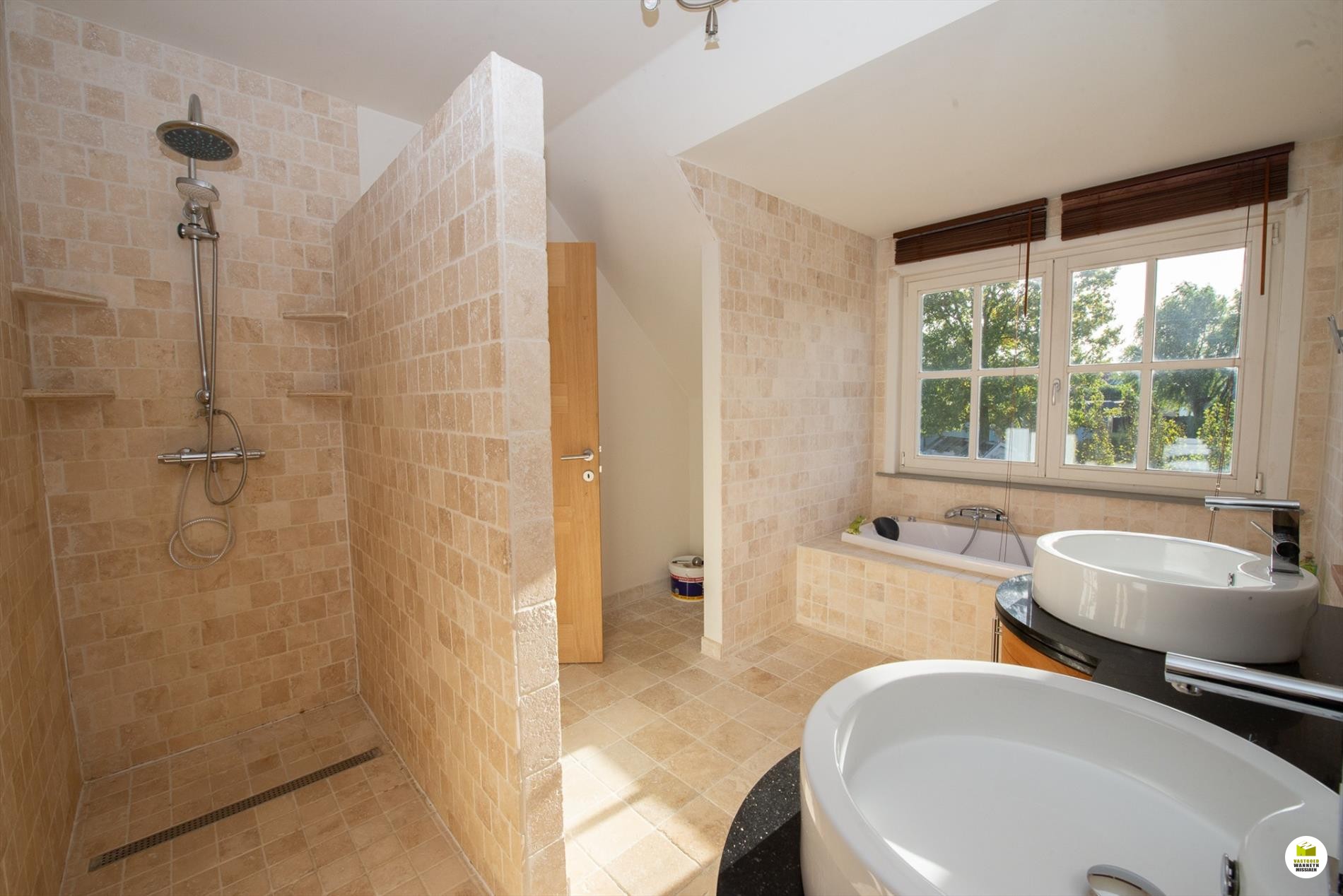 Boven zijn er 3 grote slaapkamers; 12m2, 14m2 en 24m2. De grootste slaapkamer is voorzien van een dressingruimte en exclusieve toegang naar de eerste badkamer met Jacuzzi ligbad, dubbele lavabo en grote inloopdouche. Er is een tweede badkamer die ingericht is met een inloopdouche en enkele lavabo die zich situeert naast de 2 andere slaapkamers. Er is ook een apart hangtoilet op de nachthal. De beide badkamers en het toilet zijn op dezelfde stijlvolle manier afgewerkt zoals beneden. In elke slaapkamer is er aansluiting voor Tv en internet, zelfs ook in de grootste badkamer. Alle slaapkamers en de nachthal zijn voorzien van massieve parket en massieve eiken deuren.