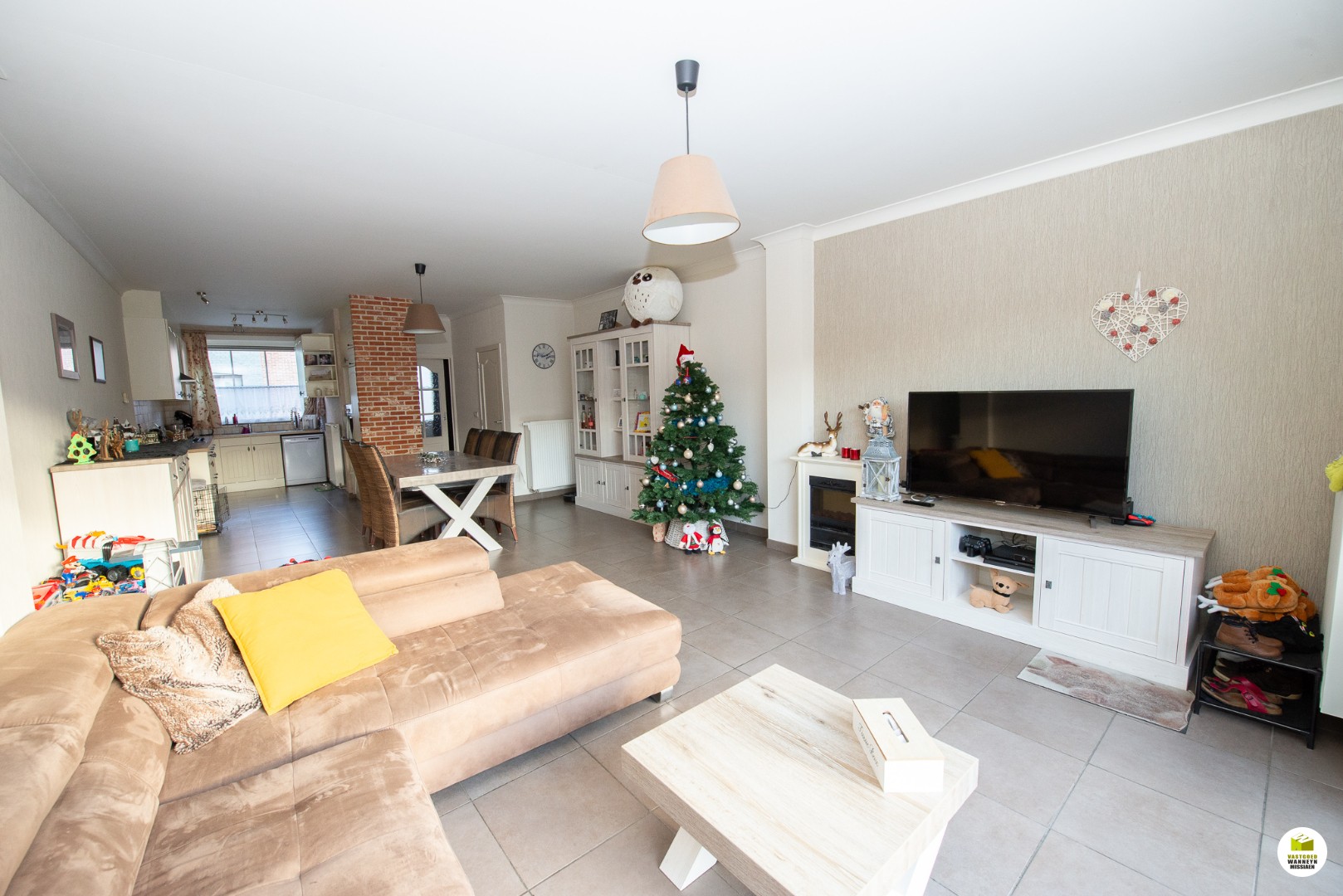 Je komt binnen in de inkomhal met vestiairenis en gastentoilet. De nis onder de trap is ideaal als bergruimte. Aansluitend de ruime lichtrijke woonkamer met een totaal ingerichte open keuken (12m x 5m)