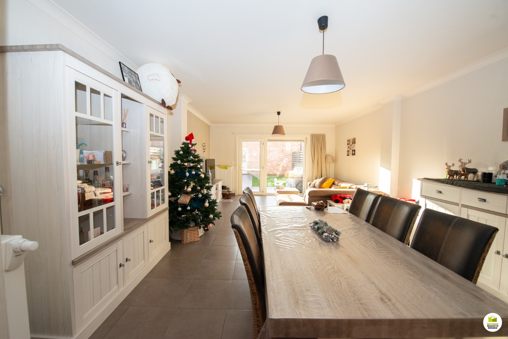 De keuken is ingericht met vaatwas, dampkap, vaatwas, warme luchtoven. De achtergevel is helemaal in glas en via een een achterdeur komen we in de tuin met aangelegd terras (15m2) en is voorzien van een automatische zonneluifel. Toegang naar de 2 garages gaat gemakkelijk via een tuinpad.