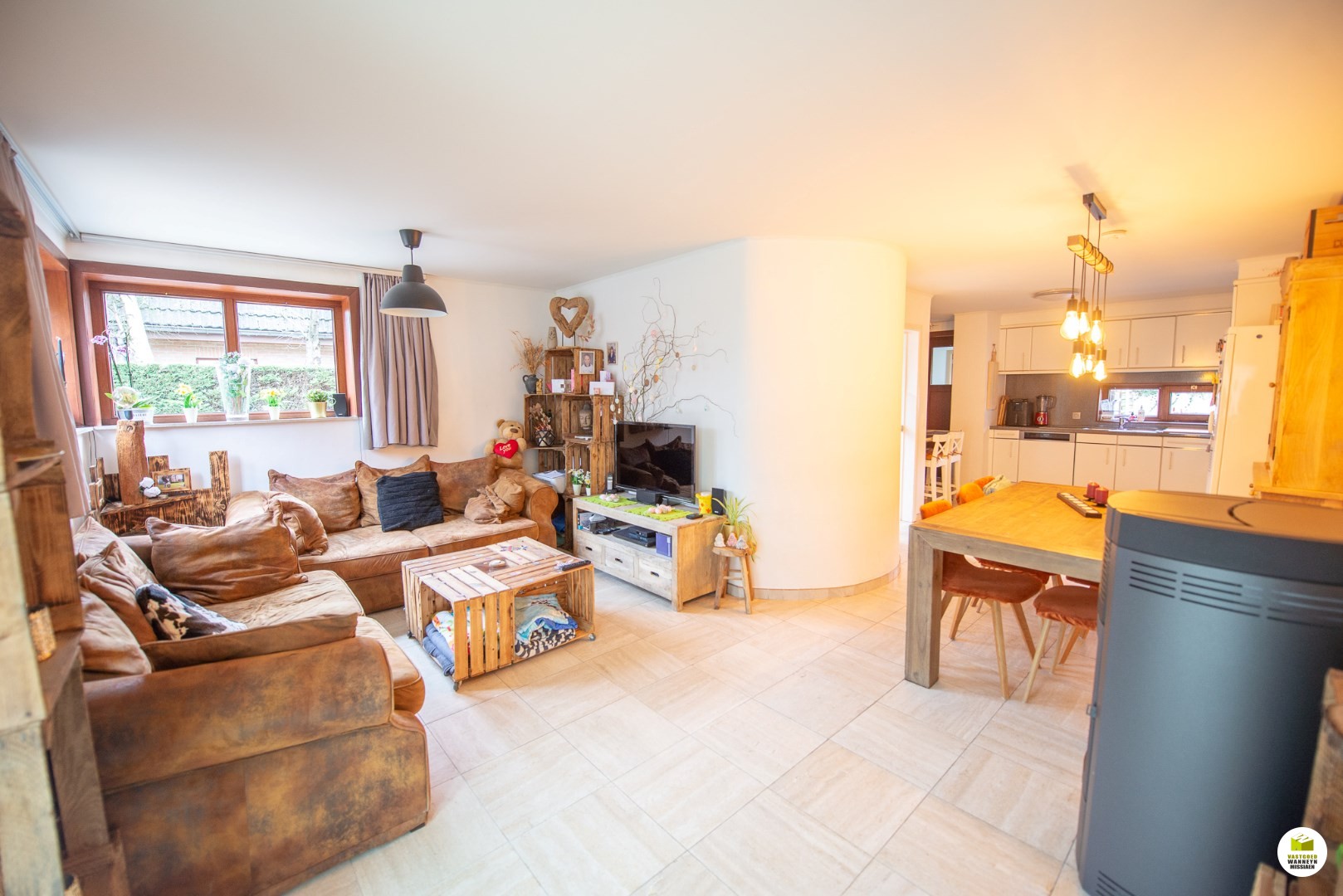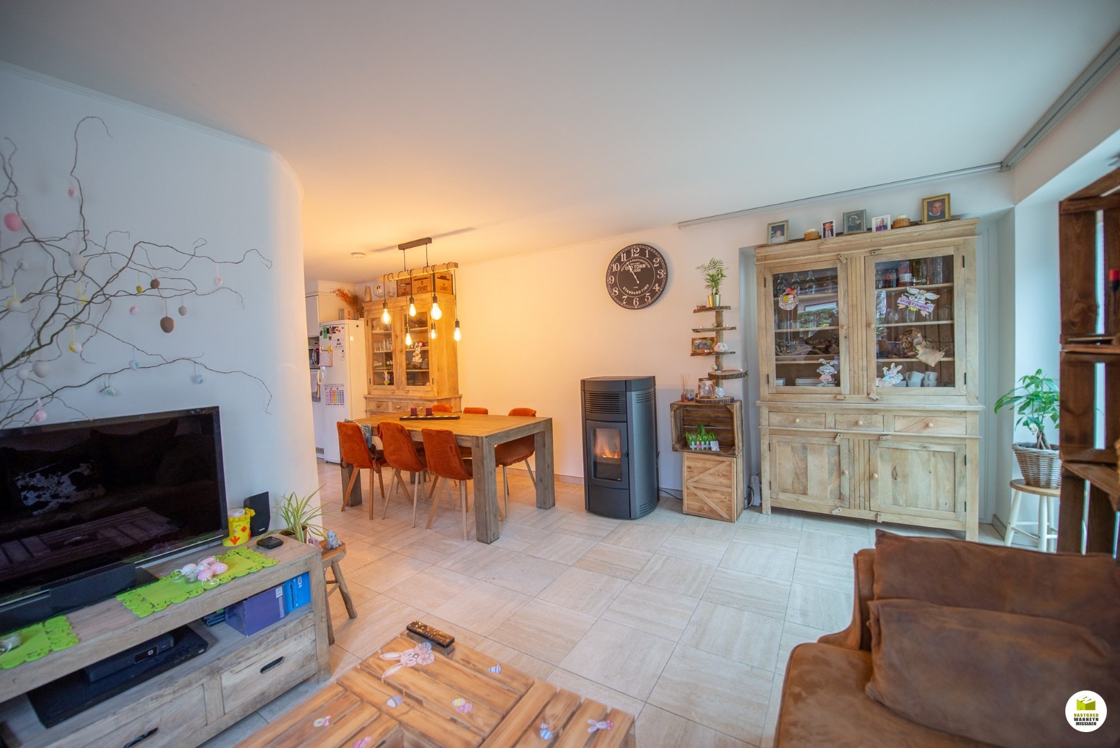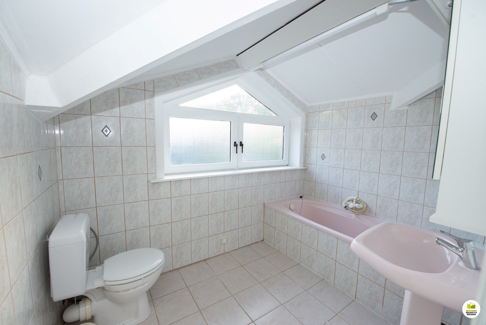 Centraal is de inkomhal gelegen met het gastentoilet. De woonkamer en de keuken is 1 open ruimte ingericht met een gezellige zithoek en aansluitend een te renoveren/nieuw te bouwen veranda. De gehele woning wordt verwarmd met de pelletkachel die in de woonkamer staat. Via de keuken bereiken we de inpandige garage die tevens dienst doet als wasplaats. Gelijkvloers is er een douchekamer met lavabo. De tweede badkamer bevindt zich op de eerste verdieping ingericht met toilet, ligbad en lavabo, deze is ook aan verjonging toe. Op het 1ste verdiep zijn er ook nog 3 slaapkamers (waarvan 1 kamer met ingebouwde kasten en 2 kleinere slaapkamers ). Buiten zijn er nog extra buitenbergingen maar deze zijn toe aan een nieuwe dakbedekking ... (asbesthoudend).