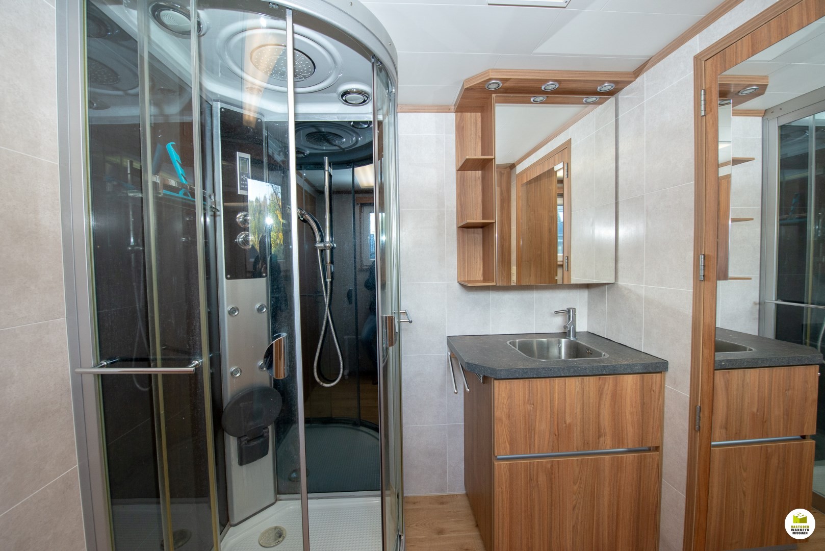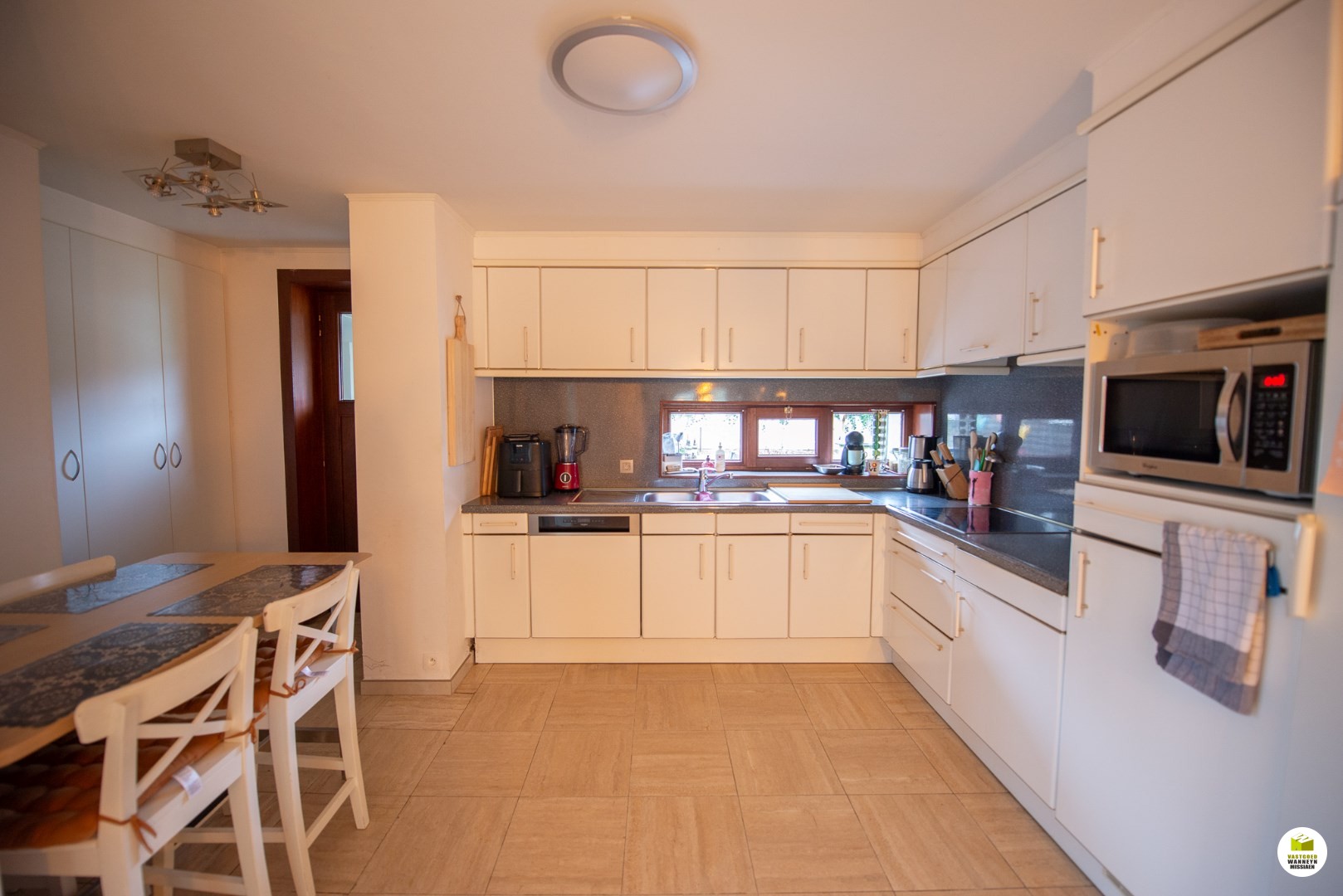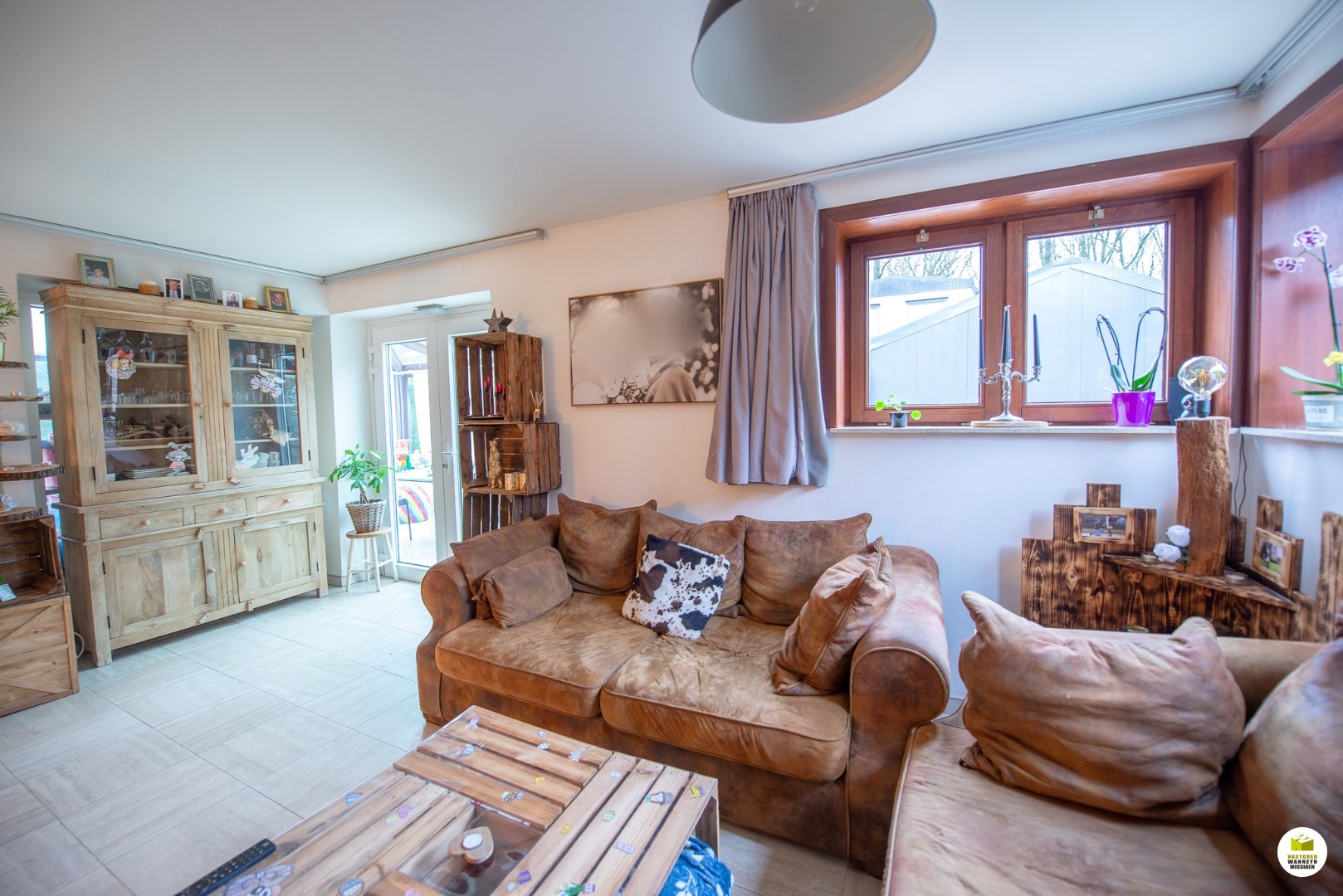 Centraal is de inkomhal gelegen met het gastentoilet. De woonkamer en de keuken is 1 open ruimte ingericht met een gezellige zithoek en aansluitend een te renoveren/nieuw te bouwen veranda. De gehele woning wordt verwarmd met de pelletkachel die in de woonkamer staat. Via de keuken bereiken we de inpandige garage die tevens dienst doet als wasplaats. Gelijkvloers is er een douchekamer met lavabo. De tweede badkamer bevindt zich op de eerste verdieping ingericht met toilet, ligbad en lavabo, deze is ook aan verjonging toe. Op het 1ste verdiep zijn er ook nog 3 slaapkamers (waarvan 1 kamer met ingebouwde kasten en 2 kleinere slaapkamers ). Buiten zijn er nog extra buitenbergingen maar deze zijn toe aan een nieuwe dakbedekking ... (asbesthoudend).