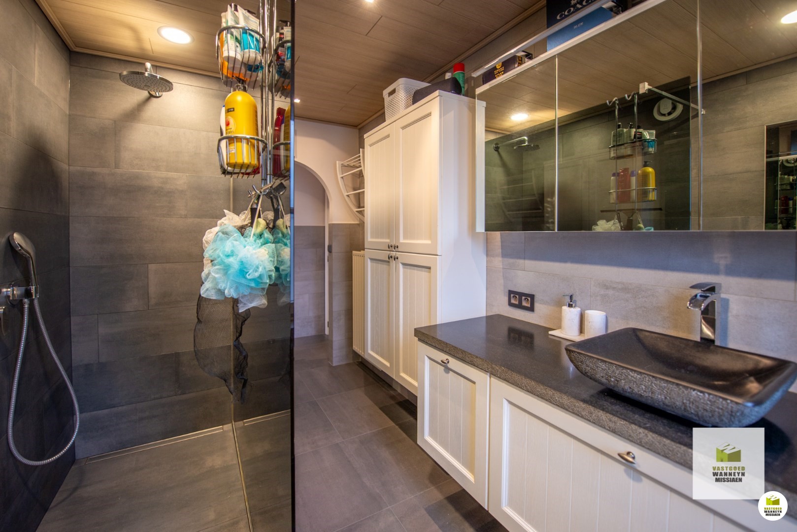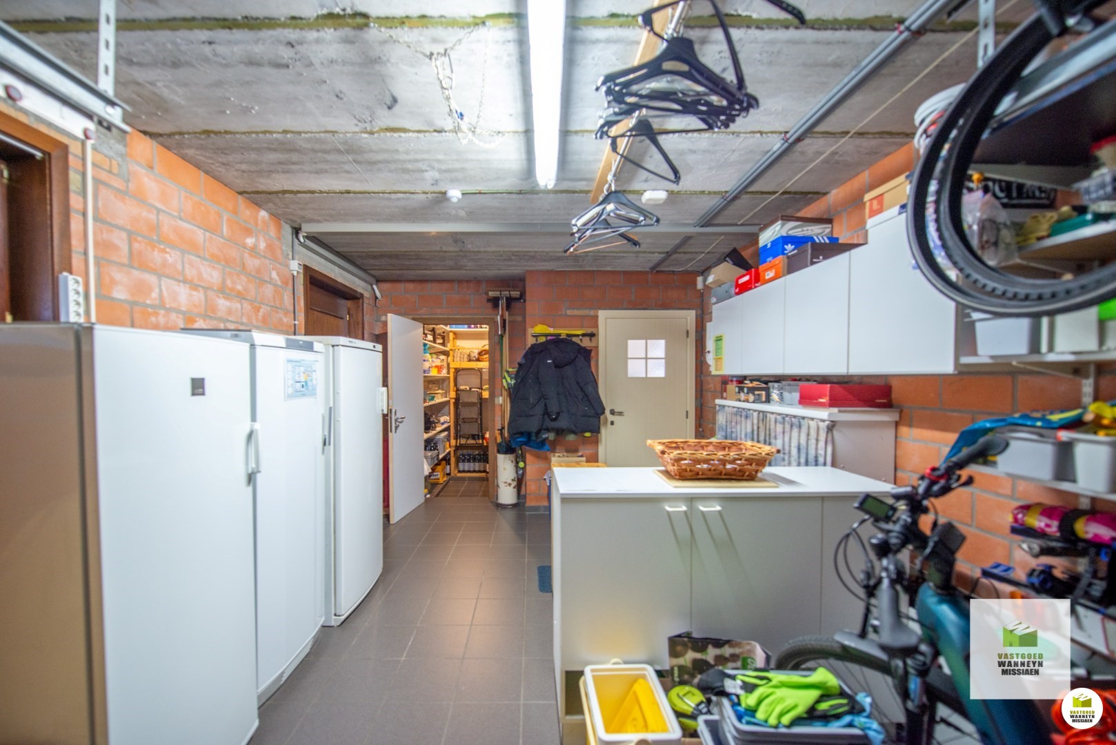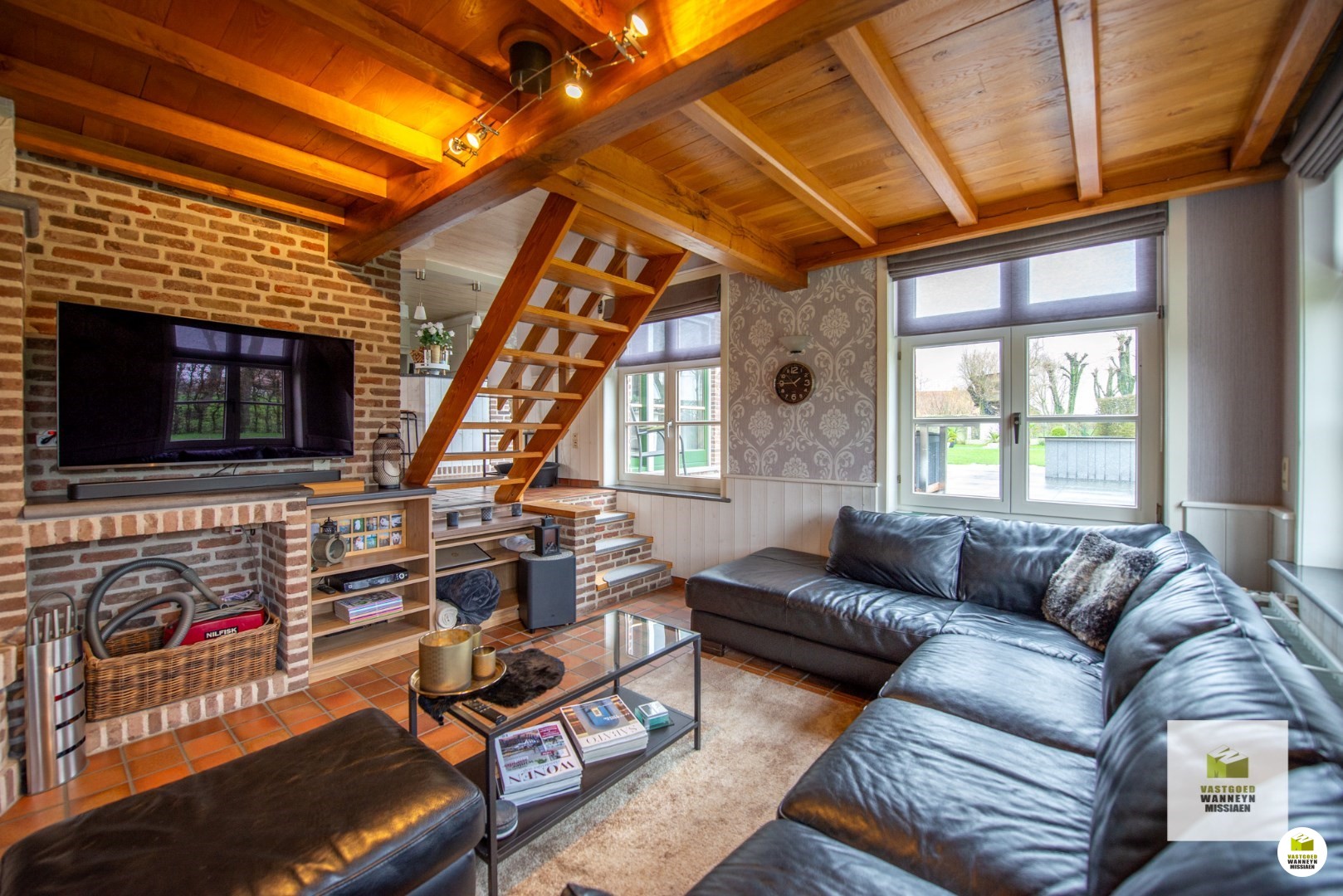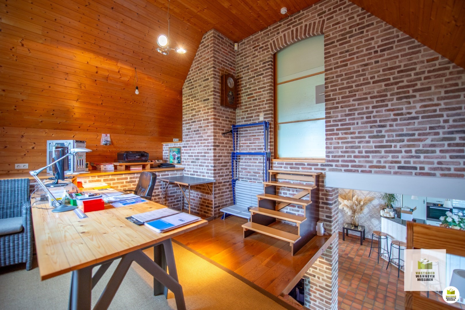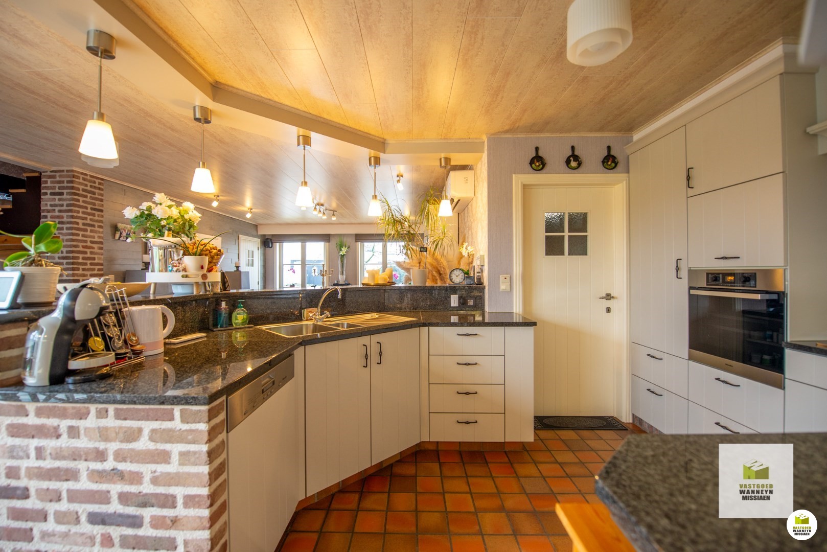 Inkomhal met inbouwkasten en een gastentoilet. De woonkamer is ruim en gezellig ingedeeld volgens een grote eetplaats met een open geïnstalleerde keuken (2010) voorzien van een bartafel en eetplaats. De tv-hoek bevindt zich in de zitput. Daardoor waan je je als het ware ín de tuin, deze plek is voorzien van een open haard en bevindt zich nabij het (huis)bureau op de mezzanine (massief eik). De nachthal op de eerste verdieping verleent toegang tot de 3 slaapkamers, waarvan één met dressing. Er is ook een extra berging die ook als slaapkamer dienst zou kunnen doen. Er is nog grote bergzolder. Achterliggend de keuken bevindt zich gelijkvloerse slaapkamer en een nieuwe badkamer (nieuw van 2018), de wasplaats en een inpandige garage met koele berging.