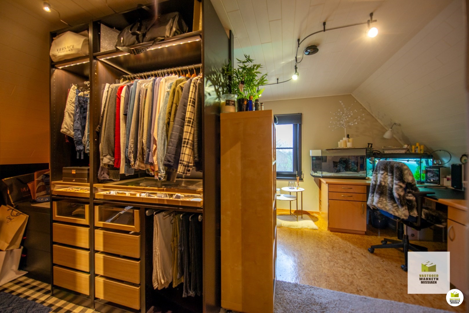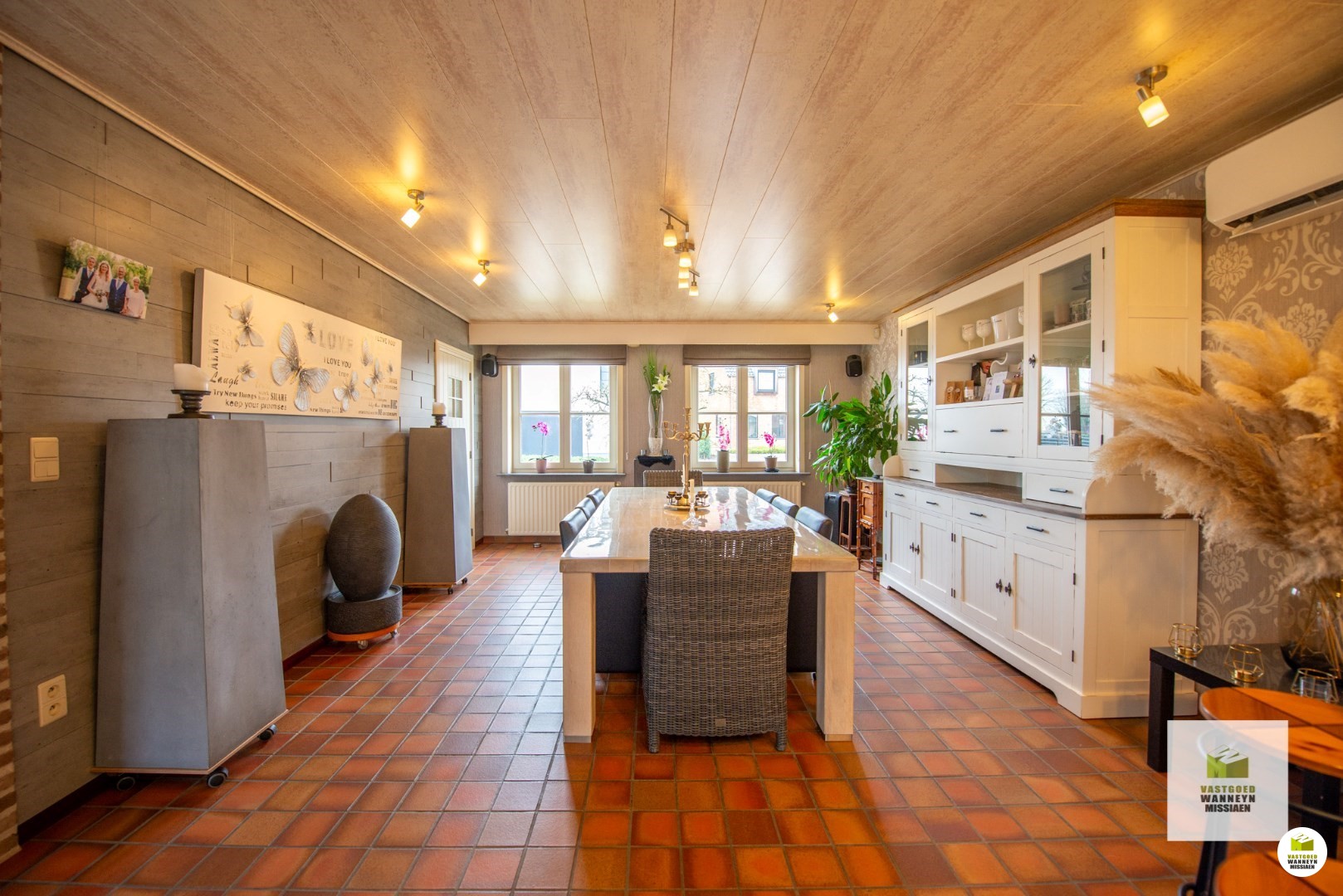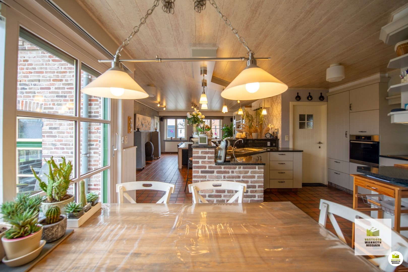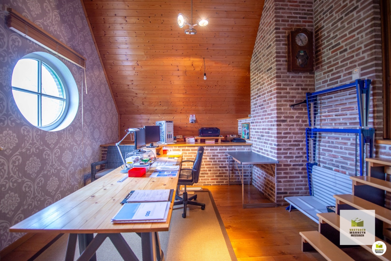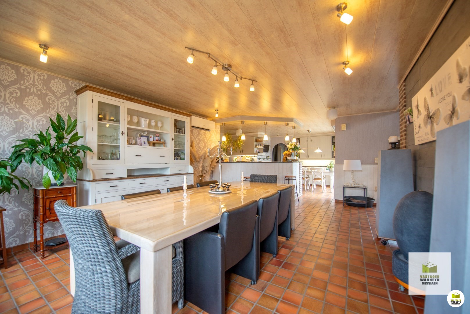 Inkomhal met inbouwkasten en een gastentoilet. De woonkamer is ruim en gezellig ingedeeld volgens een grote eetplaats met een open geïnstalleerde keuken (2010) voorzien van een bartafel en eetplaats. De tv-hoek bevindt zich in de zitput. Daardoor waan je je als het ware ín de tuin, deze plek is voorzien van een open haard en bevindt zich nabij het (huis)bureau op de mezzanine (massief eik). De nachthal op de eerste verdieping verleent toegang tot de 3 slaapkamers, waarvan één met dressing. Er is ook een extra berging die ook als slaapkamer dienst zou kunnen doen. Er is nog grote bergzolder. Achterliggend de keuken bevindt zich gelijkvloerse slaapkamer en een nieuwe badkamer (nieuw van 2018), de wasplaats en een inpandige garage met koele berging.