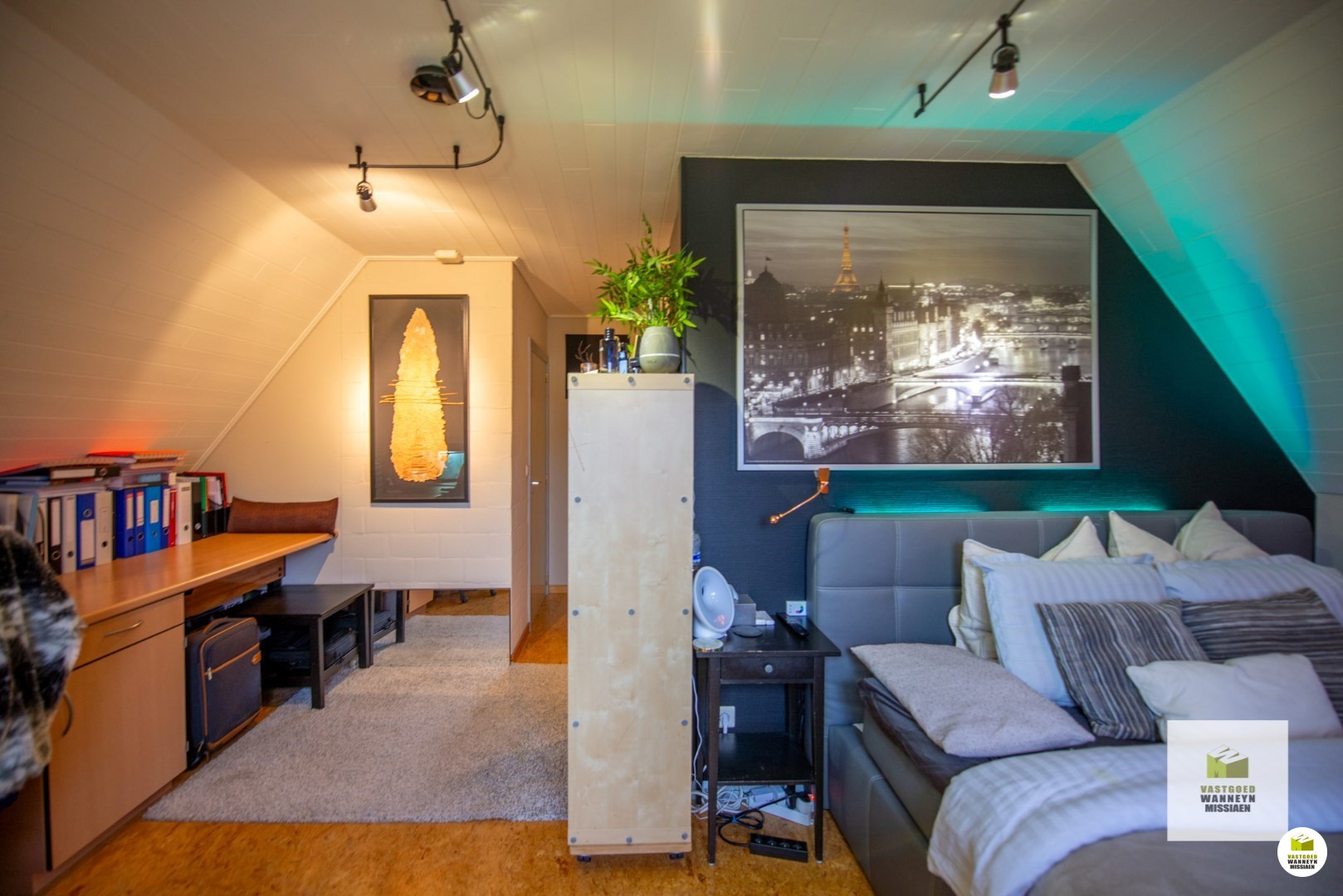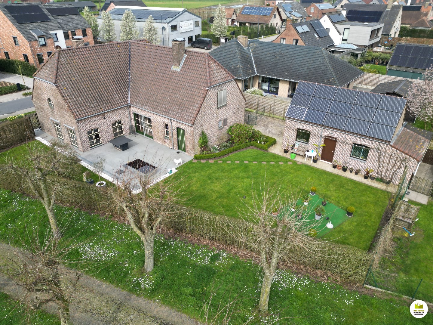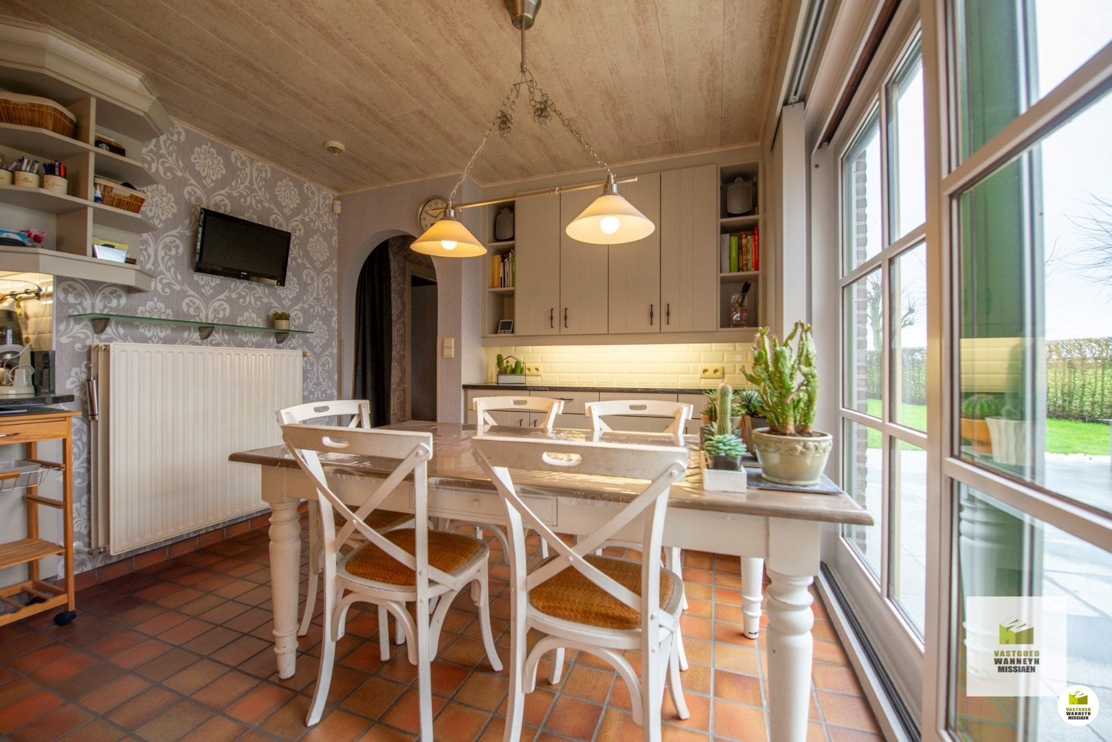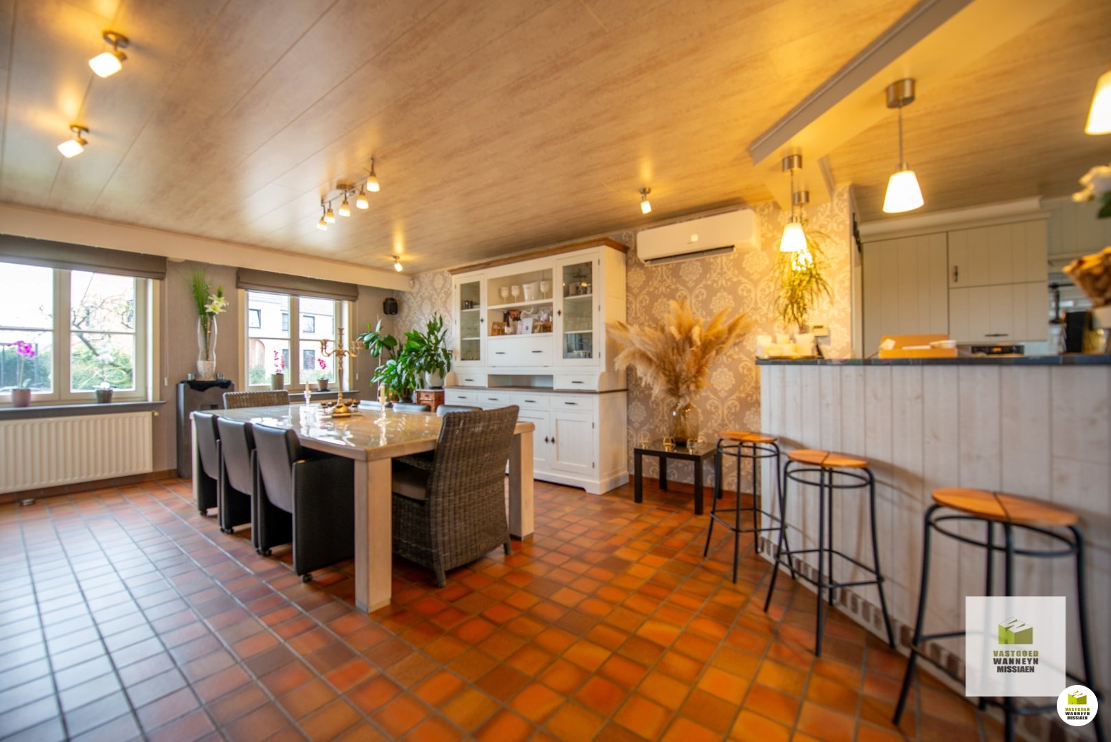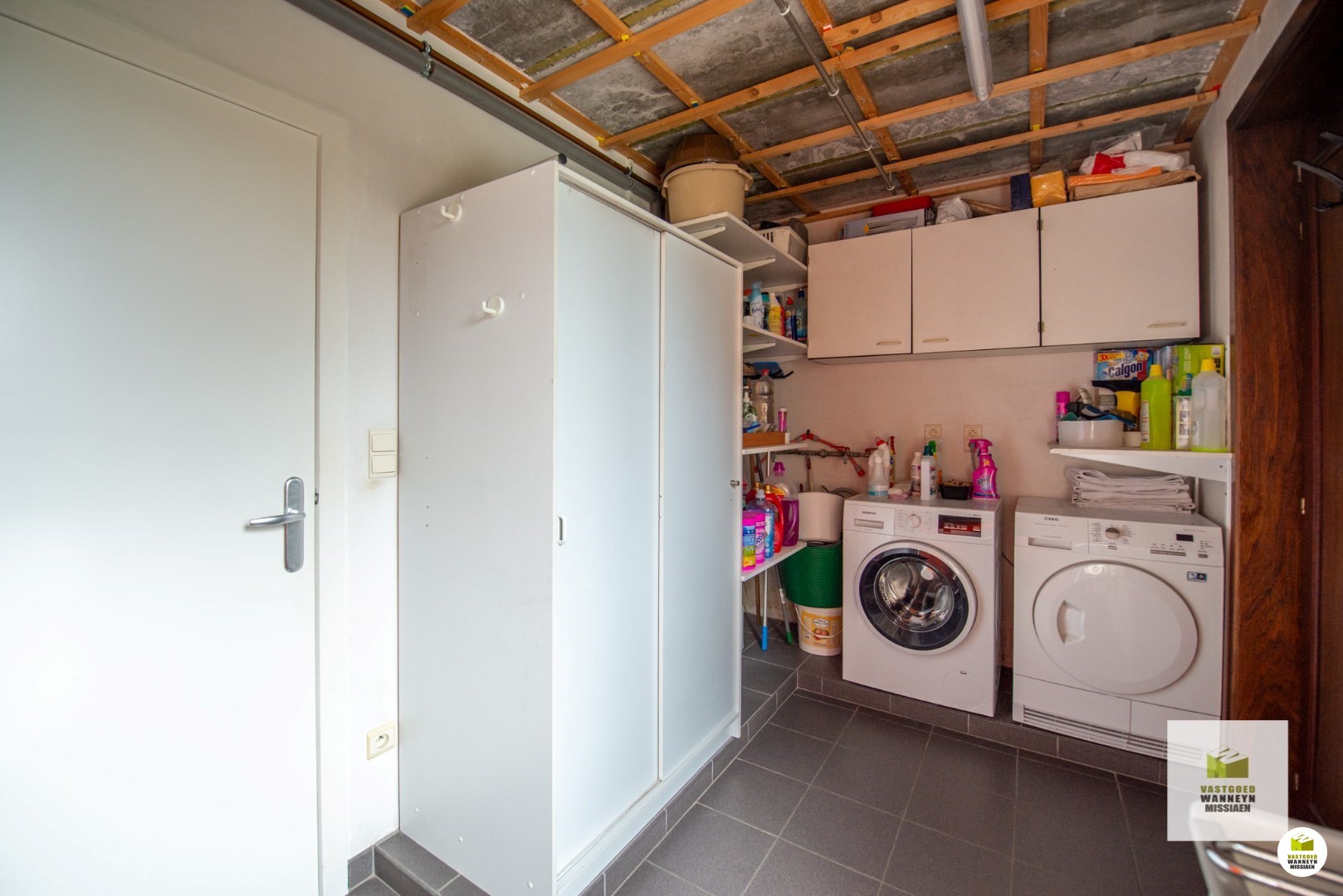 Inkomhal met inbouwkasten en een gastentoilet. De woonkamer is ruim en gezellig ingedeeld volgens een grote eetplaats met een open geïnstalleerde keuken (2010) voorzien van een bartafel en eetplaats. De tv-hoek bevindt zich in de zitput. Daardoor waan je je als het ware ín de tuin, deze plek is voorzien van een open haard en bevindt zich nabij het (huis)bureau op de mezzanine (massief eik). De nachthal op de eerste verdieping verleent toegang tot de 3 slaapkamers, waarvan één met dressing. Er is ook een extra berging die ook als slaapkamer dienst zou kunnen doen. Er is nog grote bergzolder. Achterliggend de keuken bevindt zich gelijkvloerse slaapkamer en een nieuwe badkamer (nieuw van 2018), de wasplaats en een inpandige garage met koele berging.