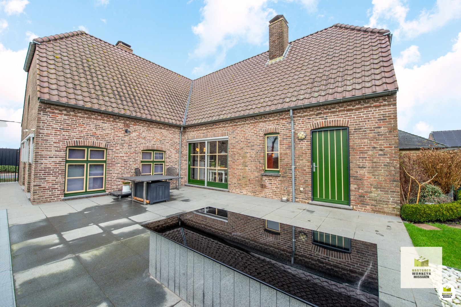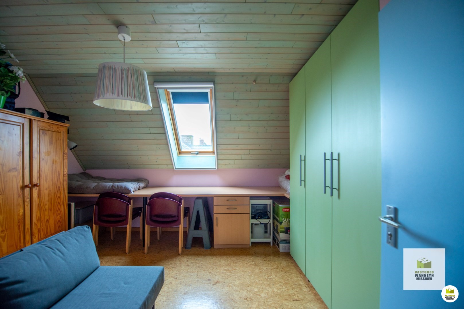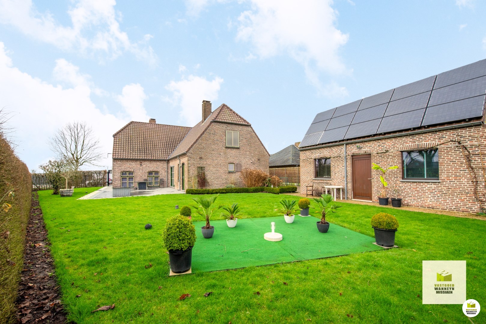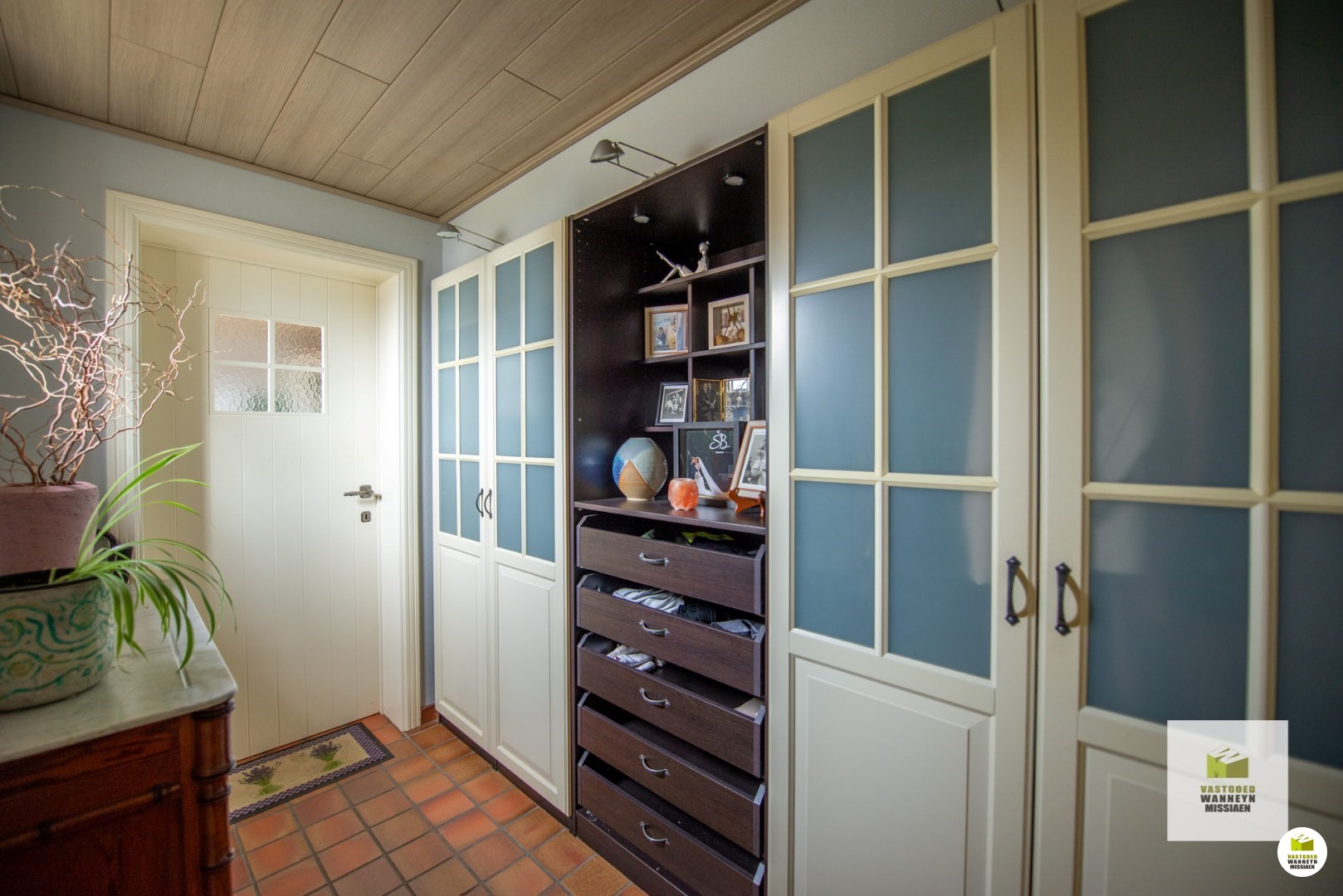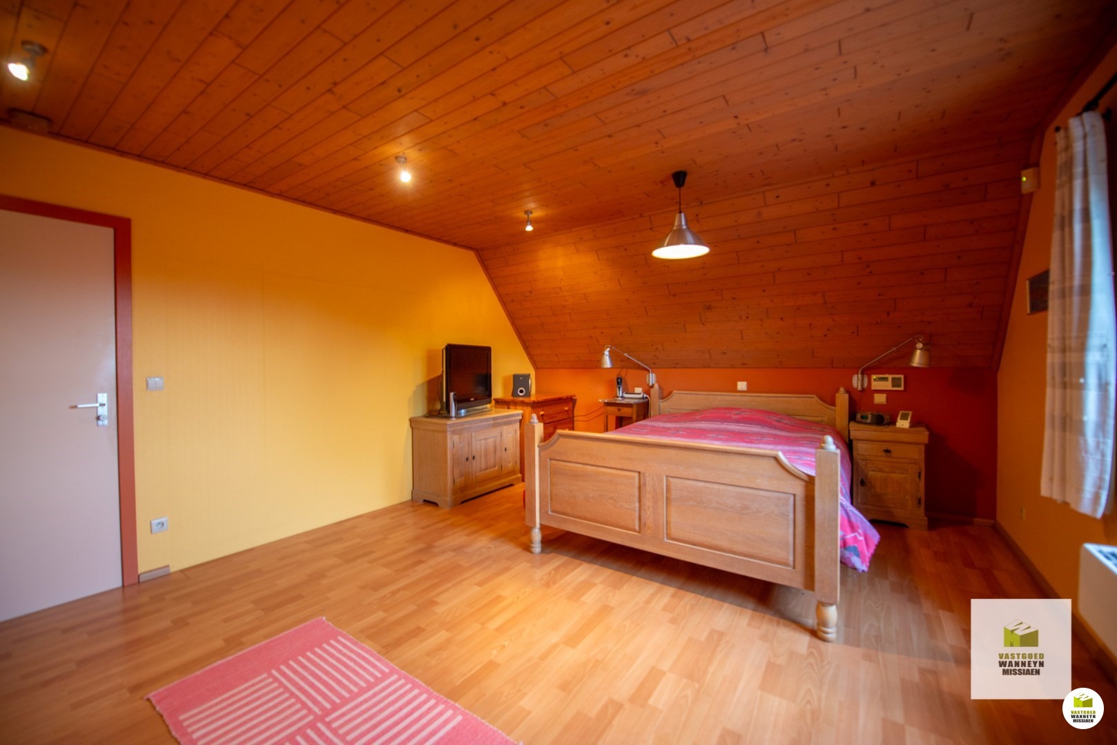 Inkomhal met inbouwkasten en een gastentoilet. De woonkamer is ruim en gezellig ingedeeld volgens een grote eetplaats met een open geïnstalleerde keuken (2010) voorzien van een bartafel en eetplaats. De tv-hoek bevindt zich in de zitput. Daardoor waan je je als het ware ín de tuin, deze plek is voorzien van een open haard en bevindt zich nabij het (huis)bureau op de mezzanine (massief eik). De nachthal op de eerste verdieping verleent toegang tot de 3 slaapkamers, waarvan één met dressing. Er is ook een extra berging die ook als slaapkamer dienst zou kunnen doen. Er is nog grote bergzolder. Achterliggend de keuken bevindt zich gelijkvloerse slaapkamer en een nieuwe badkamer (nieuw van 2018), de wasplaats en een inpandige garage met koele berging.
