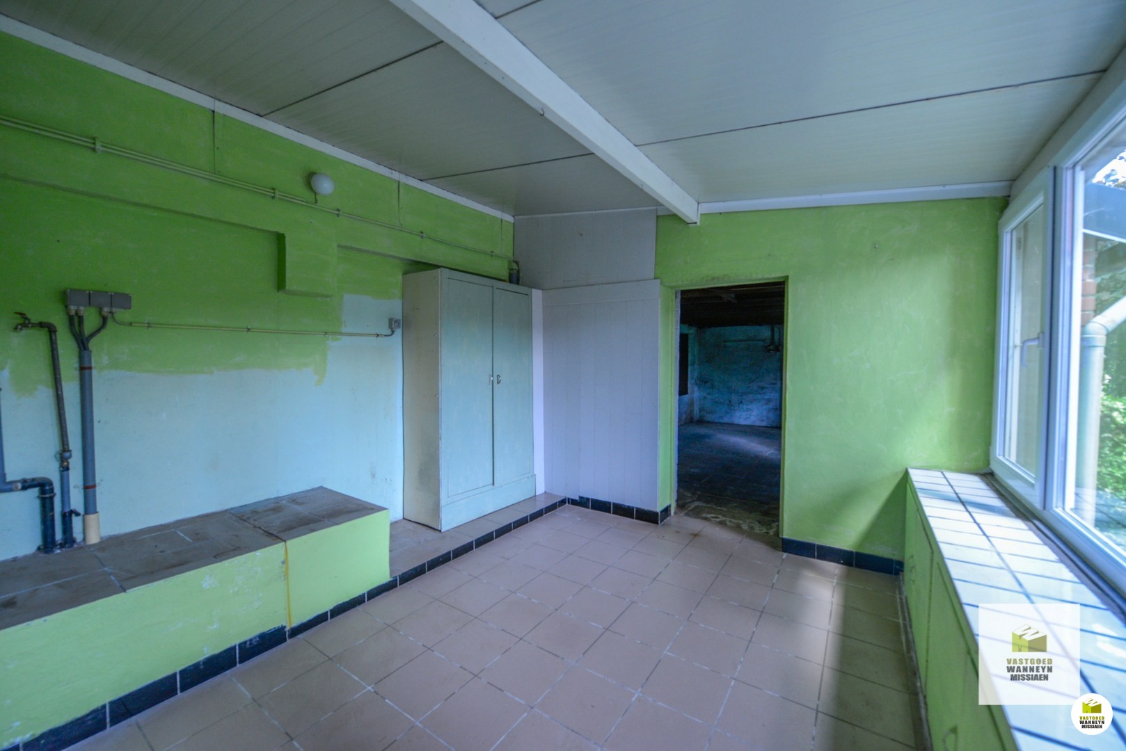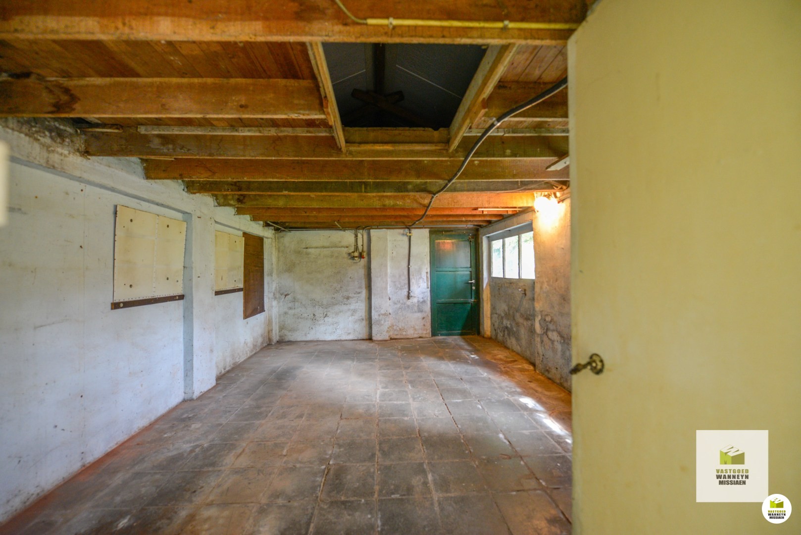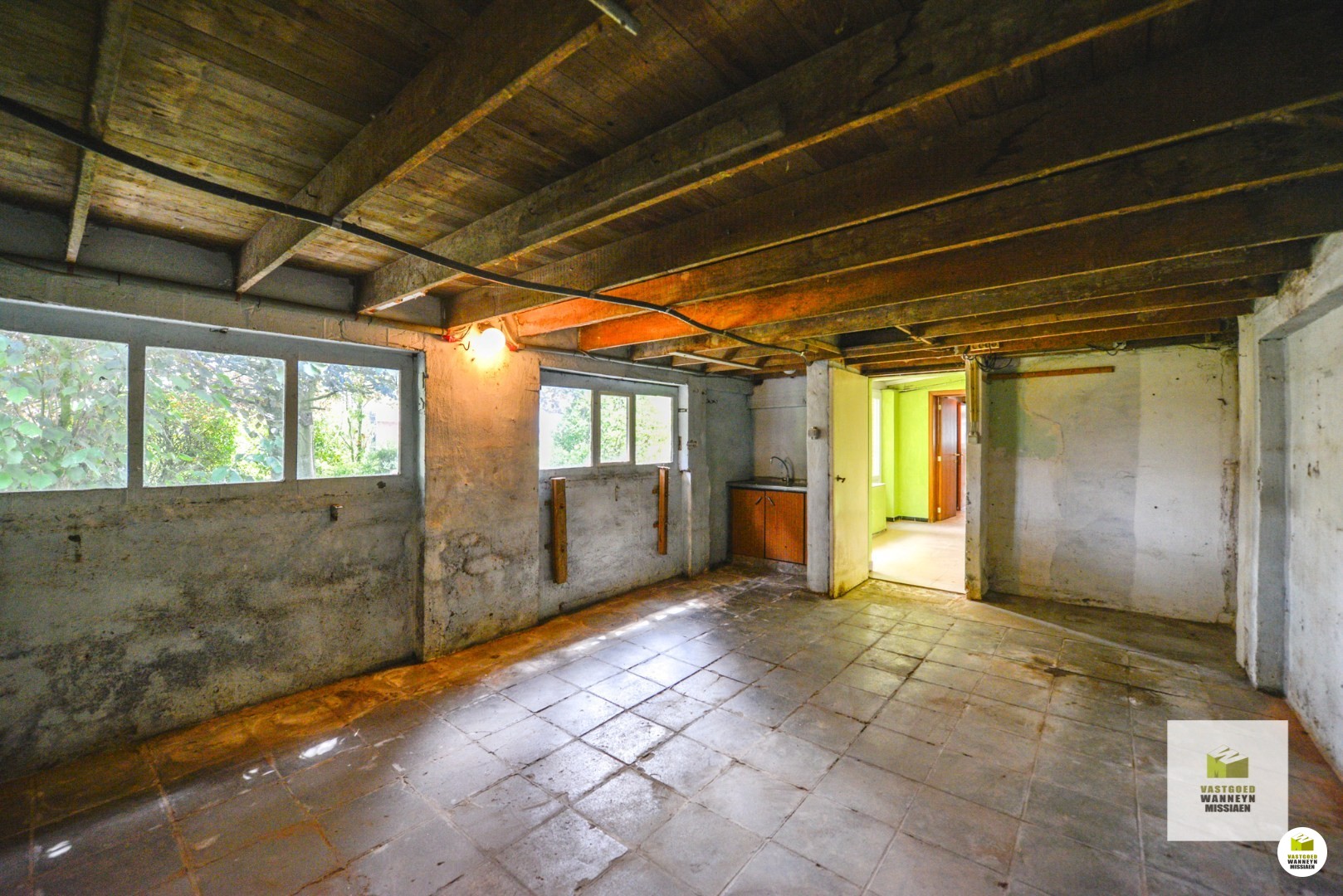 Indeling: inkom met gastentoilet, bureau of gelijkvloerse slaapkamer, lichtrijke leefruimte met gascassette, basis ingerichte keuken met eetplaats voor een 4 tal mensen. Er bevindt zich nog een bergzolder boven de keuken. Naast de keuken is de badkamer met aansluitend veranda/wasplaats en atelierruimte 23 m2. Op de 1ste verdieping zijn er 3 slaapkamers en een ruimte voor een extra badkamer te voorzien. Er is nog een tweede bergzolder. De woning dient gerenoveerd te worden, er zijn uitbreidingsmogelijkheden. De tuin kan beter geïntegreerd worden met de woning door bv de woonkamer/keuken te maken in de ruimte waar nu het atelier is..