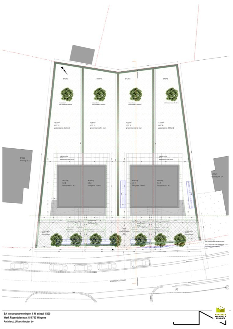 De 4 loten meten tussen 400 m2 en 460 m2