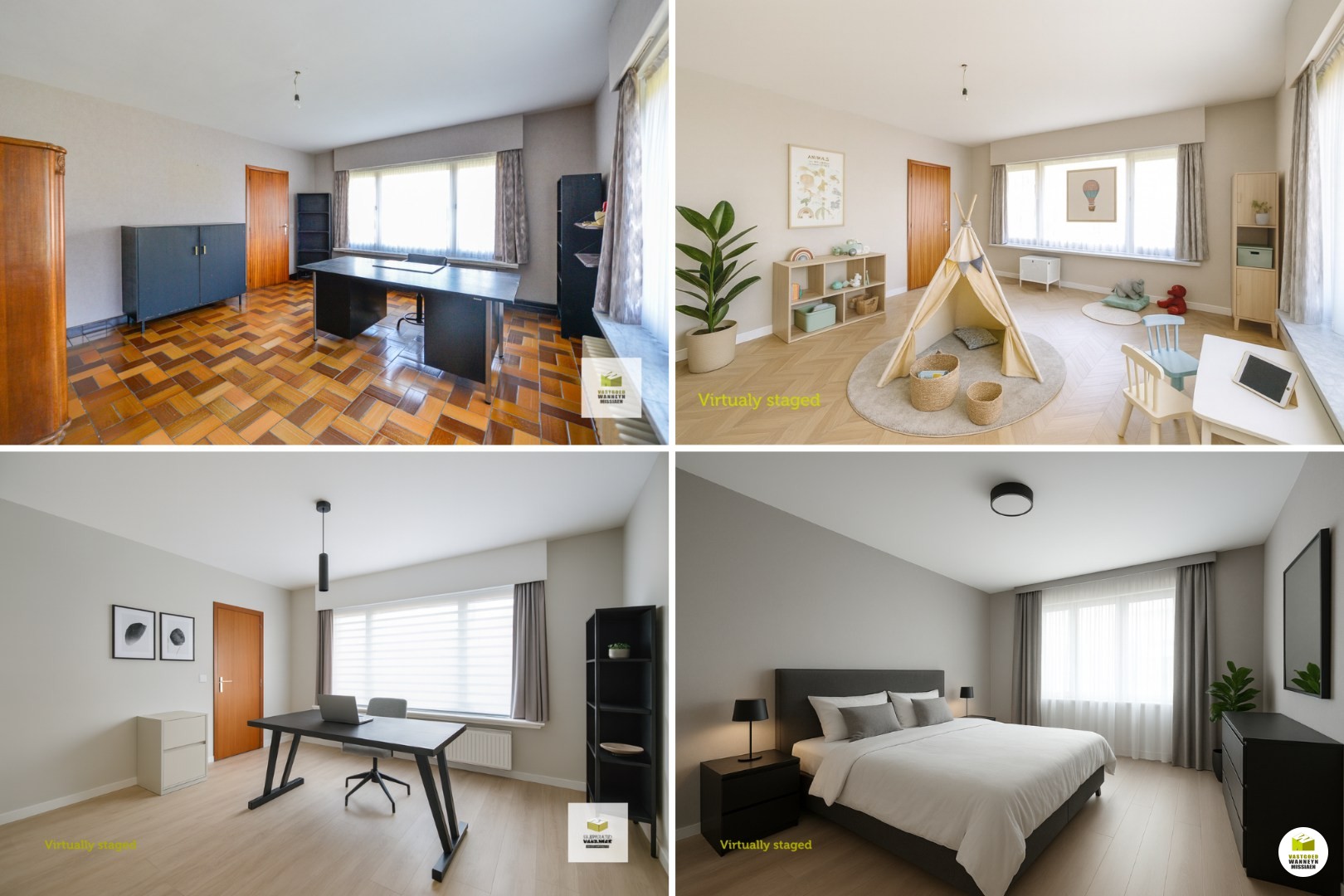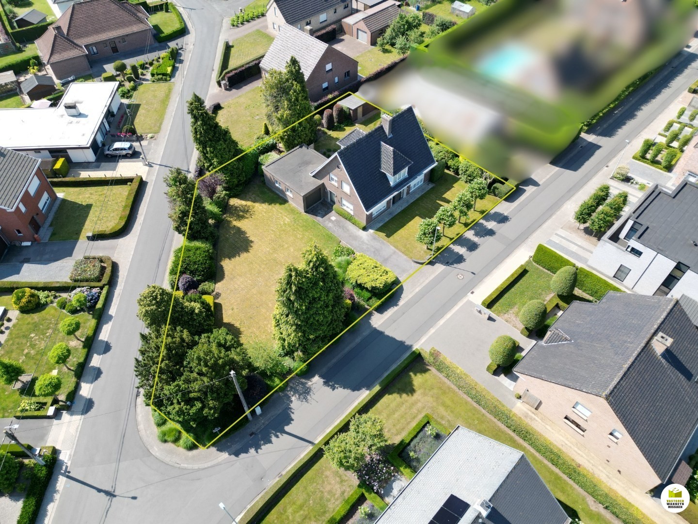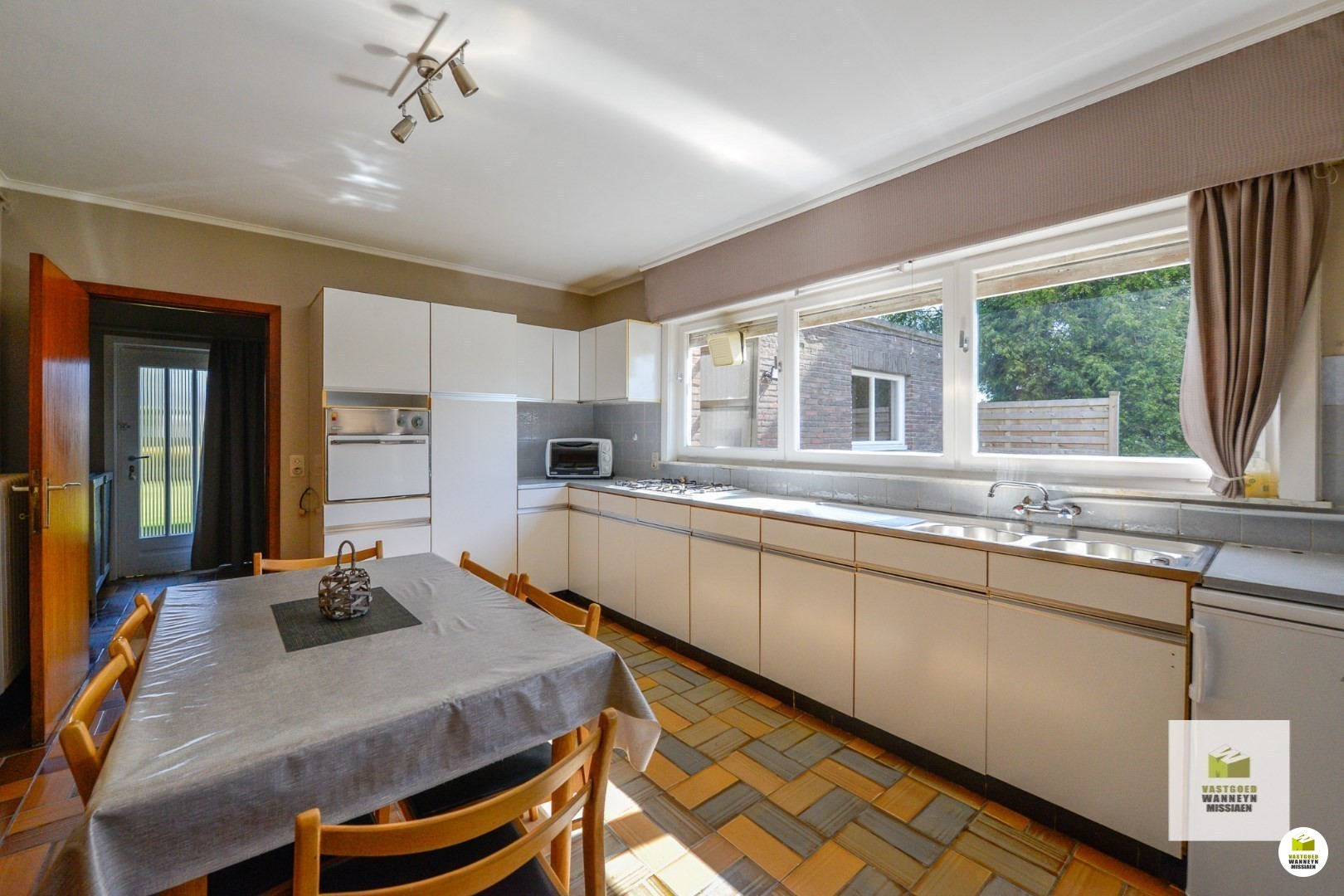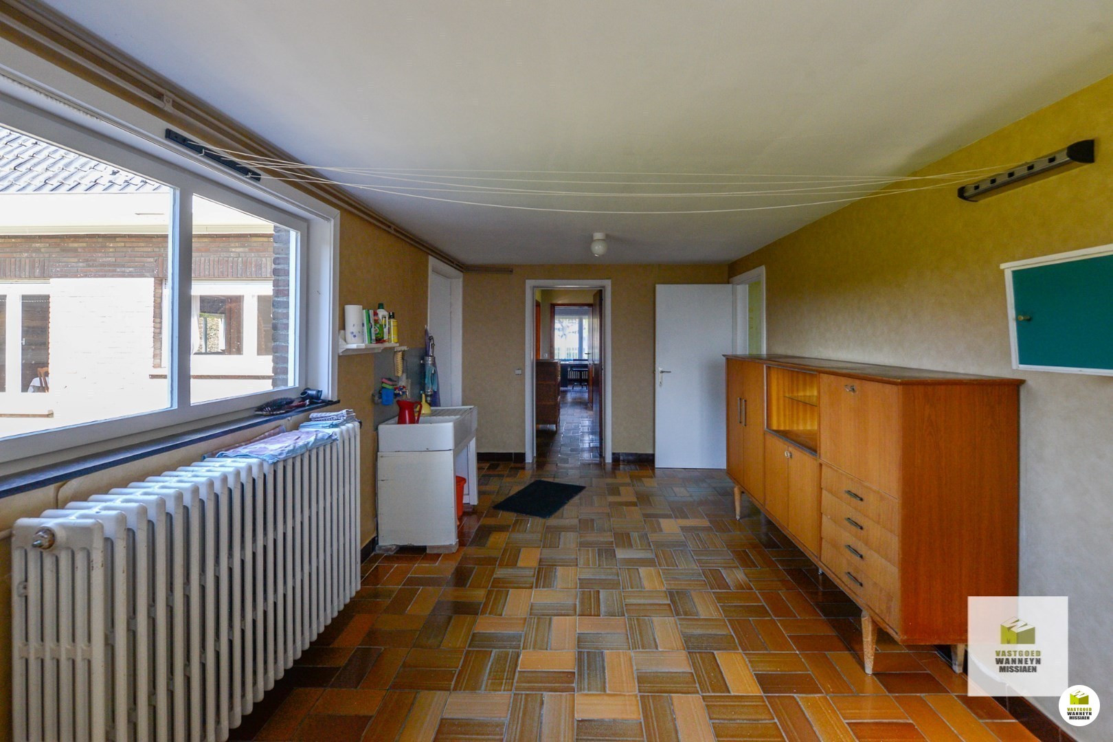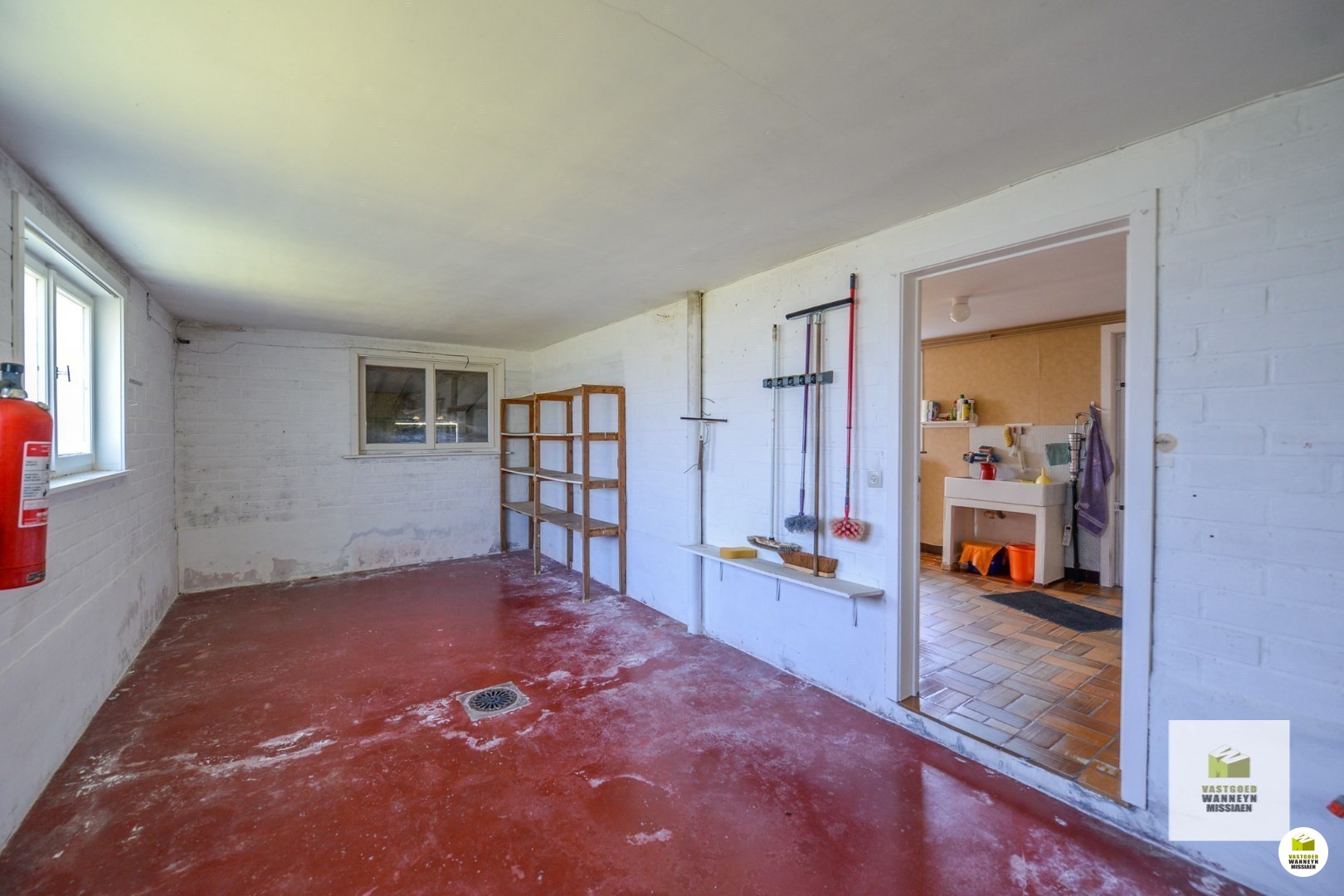 Er zijn 2 voordeuren, de ene voordeur zit op de zijkant van het huis waar het gastentoilet, de vestiaire en het gelijkvloers bureel van 4,30 m x 4,75 m zich bevindt. Deze ruimte kan ook zeer geschikt zijn als speelkamer gezien deze ruimte grenst aan de keuken. Aanpalend vinden we de wasplaats van 6 m x 3 m met doorgang naar de tuin én een inpandige garage van 3,20 m x 7,60 m.