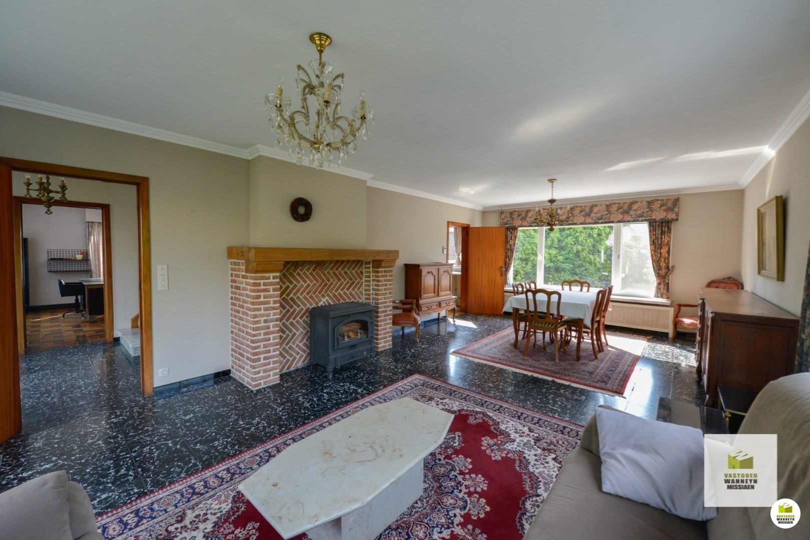 er is onmiddellijk toegang naar het bureau, de keuken en de woonkamer. De woonkamer meet 8,40 m x 4,50 m, er is een schouw waar nu een houtkachel staat. De keuken paalt aan de woonkamer en meet 4,5 m x 3,50 m. Vanuit alle ruimtes heb je zicht op de tuin.