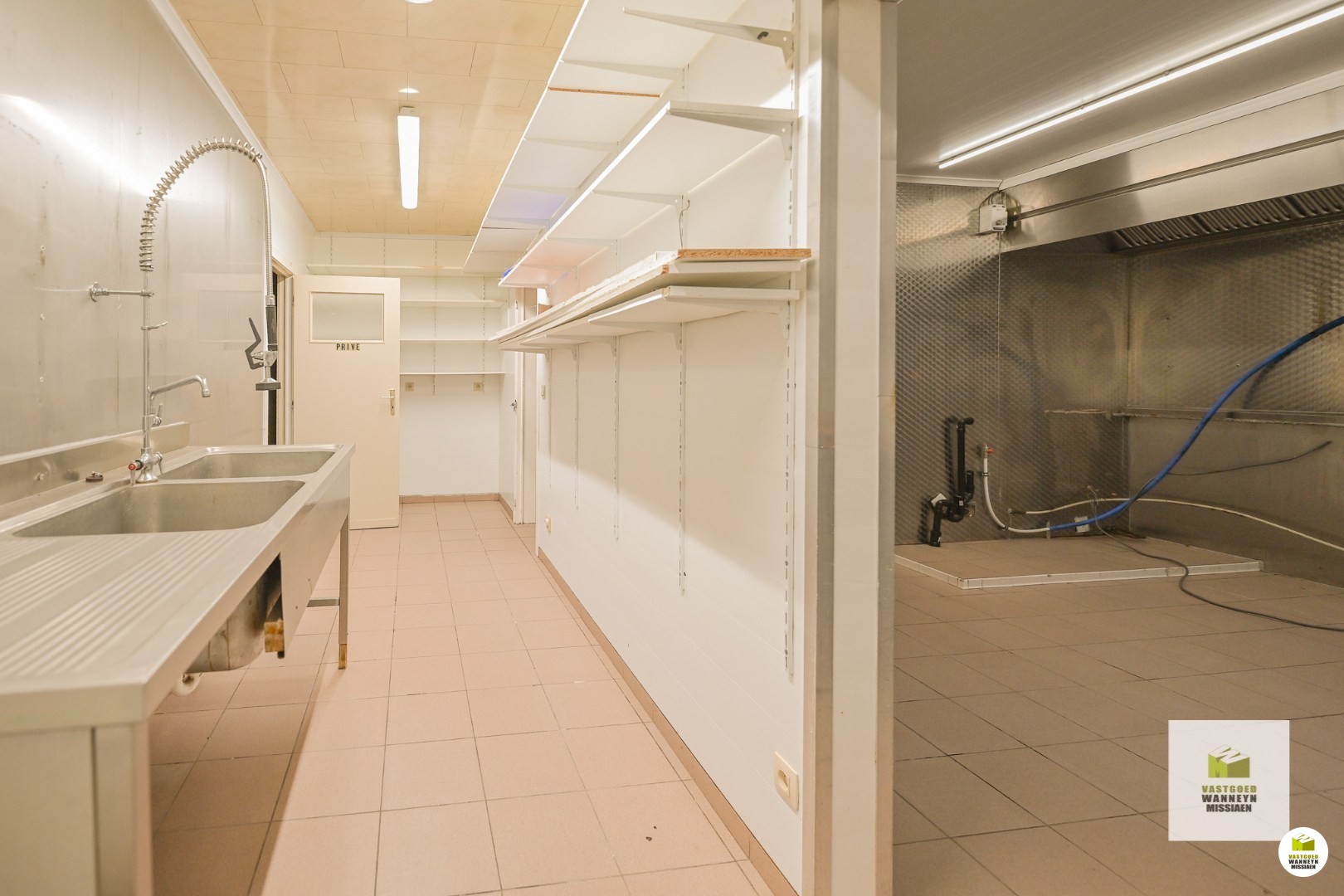 Achteraan bevinden zich praktische voorzieningen zoals een keuken, ... bergruimte, sanitair, en een inpandige garage met kelder.