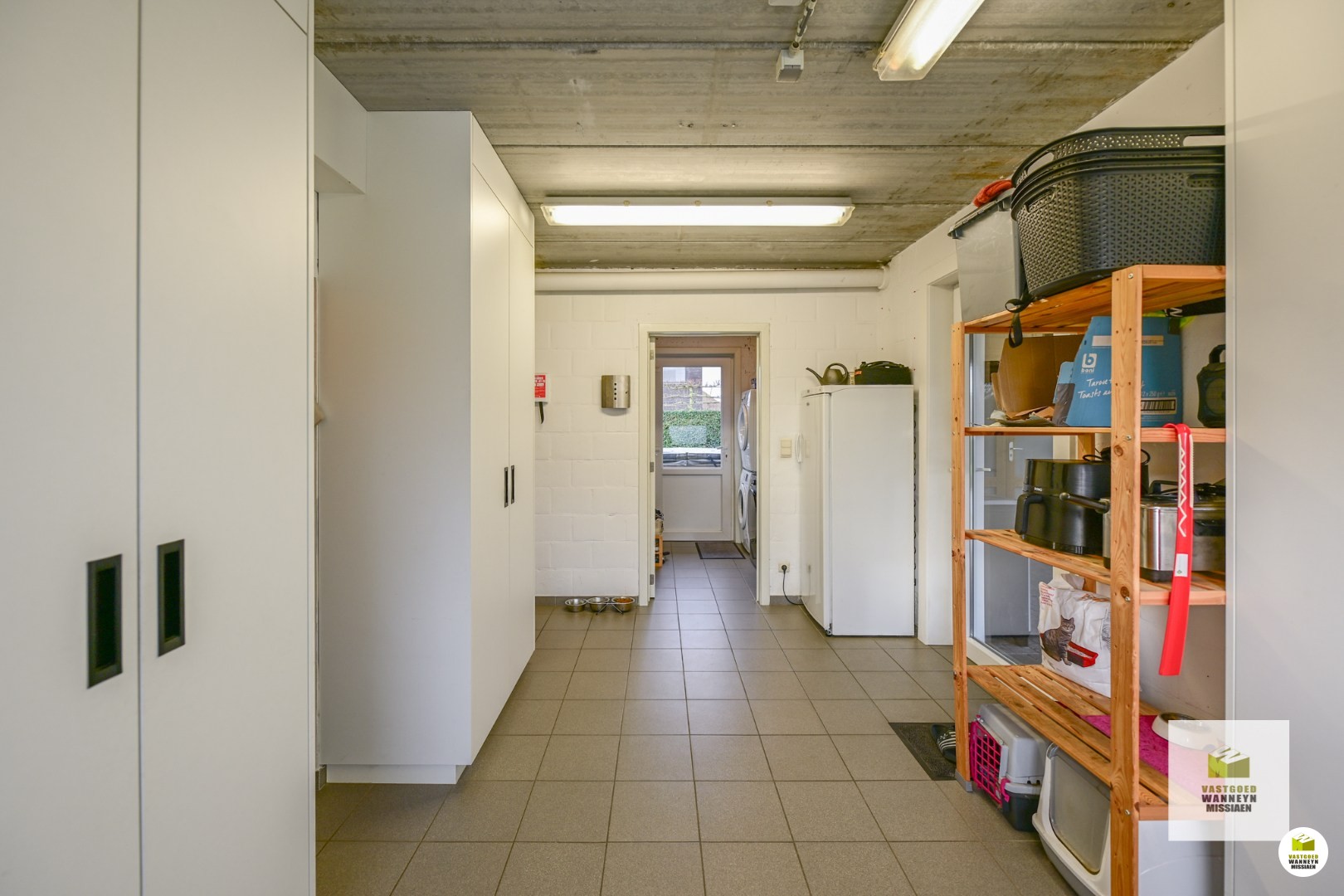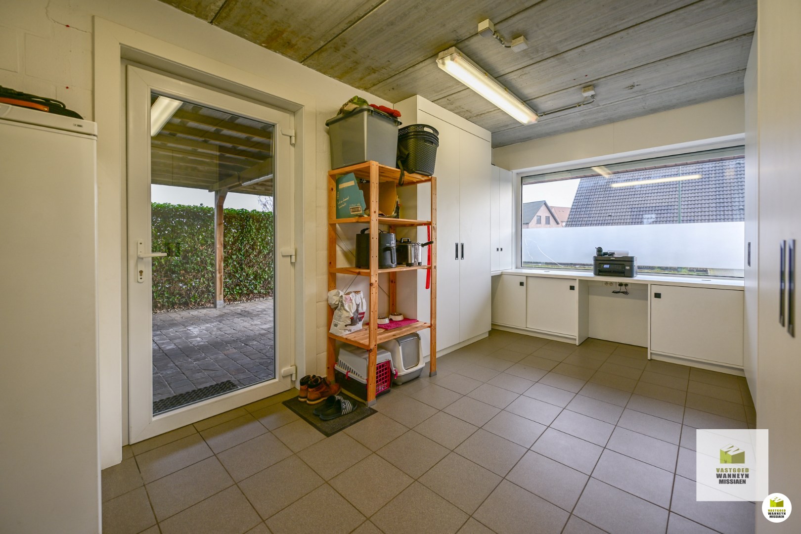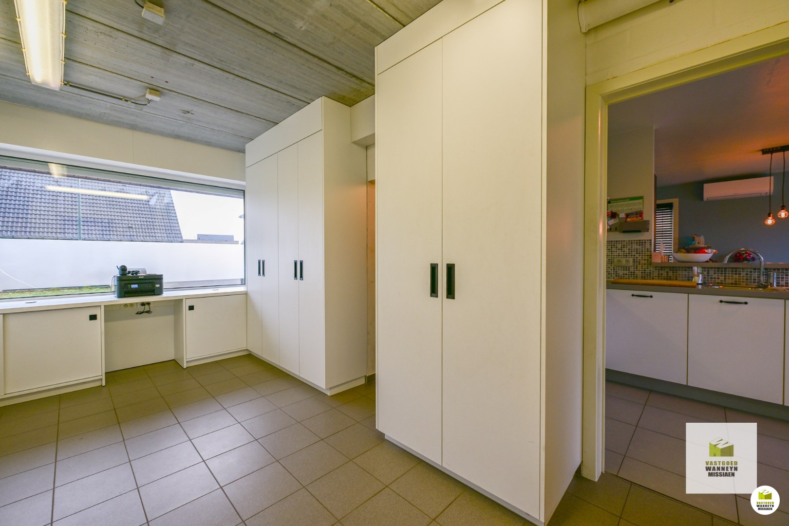Verder komen we in de praktische berging. Deze voormalige garage werd omgebouwd tot bergruimte met ingebouwde kasten en zelfs een ingebouwde bureau. Vanuit deze ruimte is toegang tot de wasplaats met achterdeur en carport. Ideaal voor wanneer je thuiskomt met boodschappen en deze graag ... meteen op z'n plaats zet!