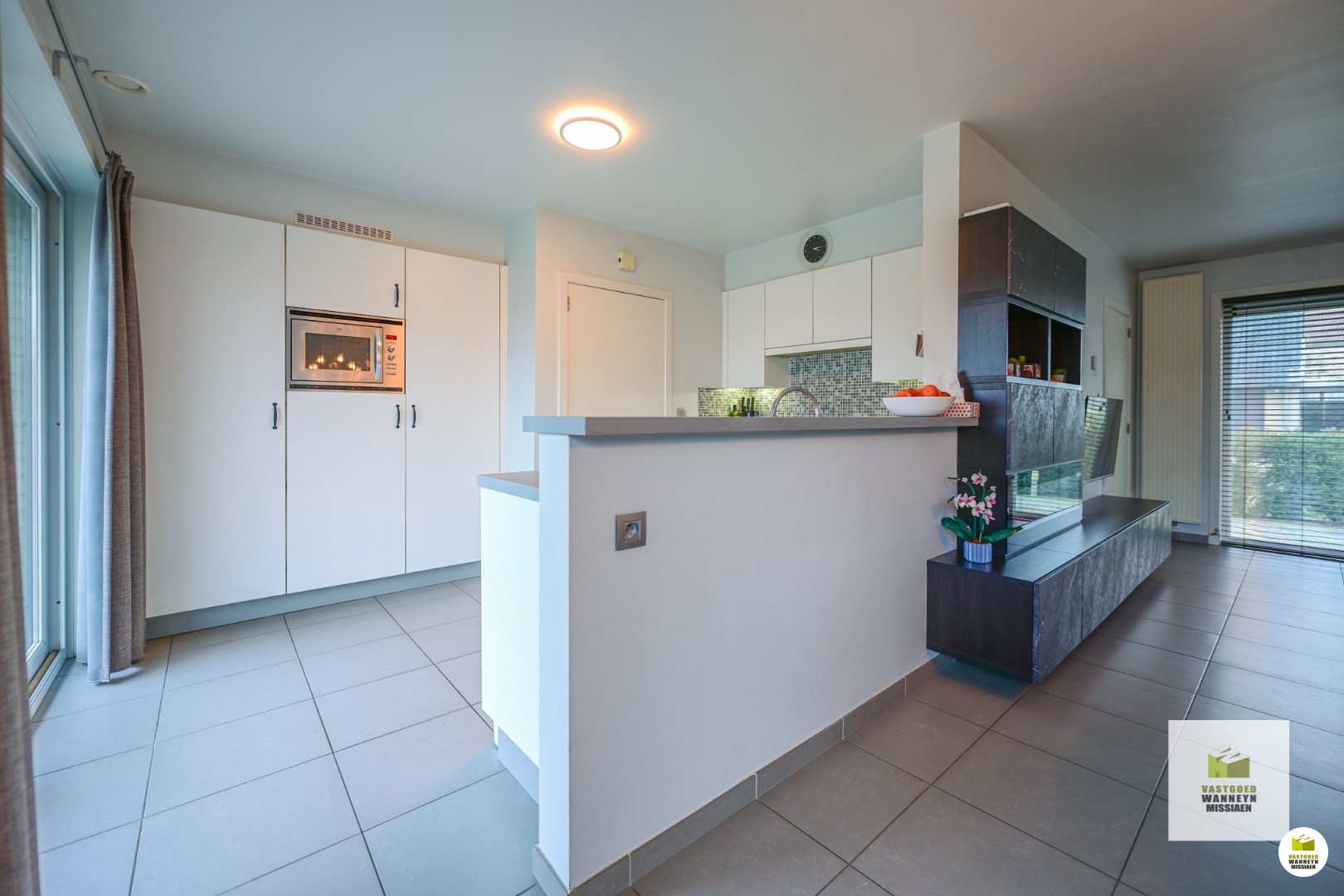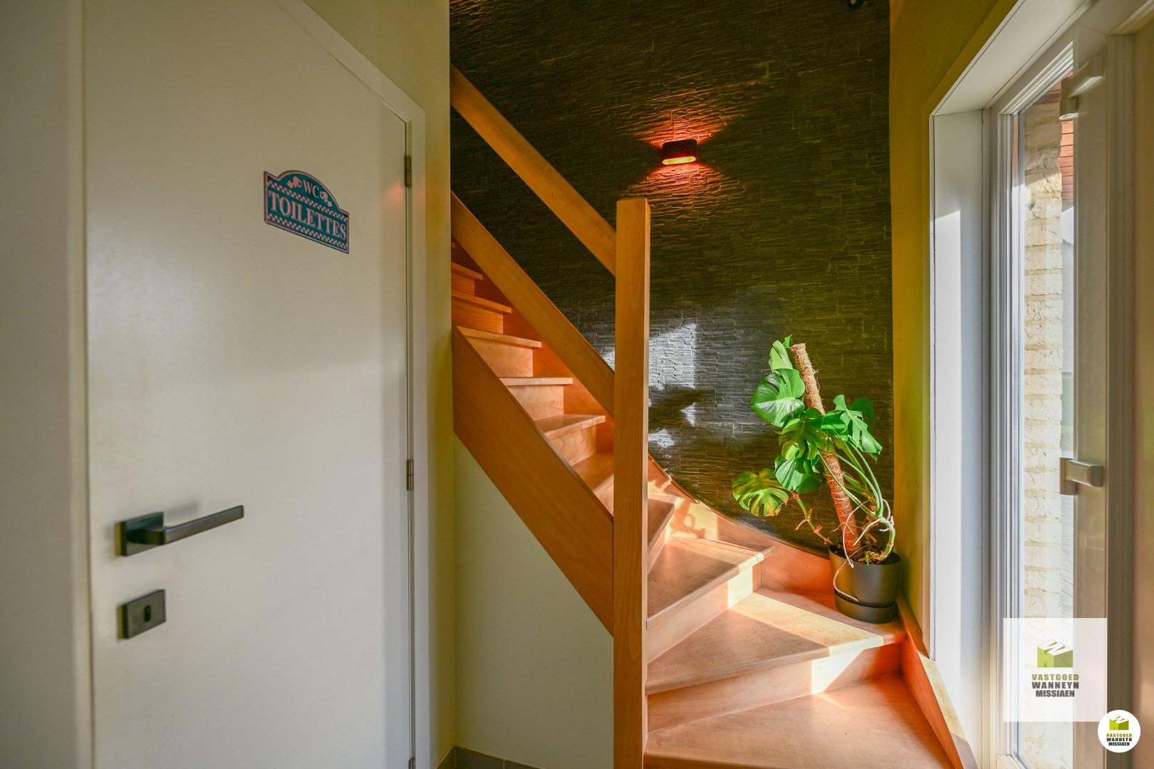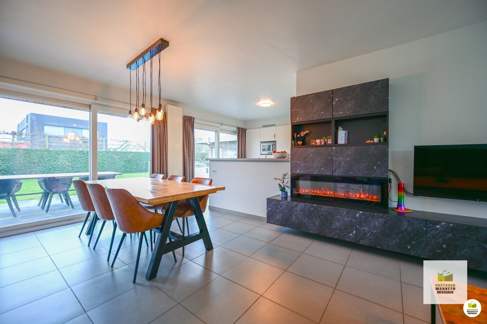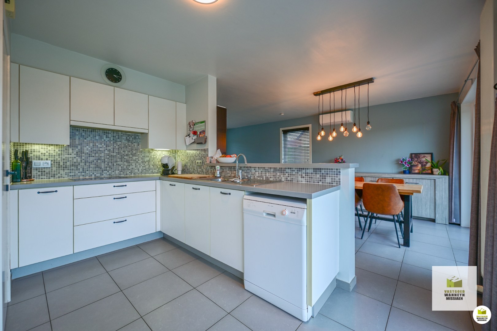 Indeling: Binnenkomen in de ruime en lichtrijke inkomhal met apart gastentoilet. Vervolgens de leefruimte met aanpalend de eetplaats en open keuken. De keuken werd voorzien van alle hedendaagse toestellen: vaatwasmachine, oven, ingebouwde frigo, kookplaat met dampkap ect. Vanuit zowel de zithoek, eetplaats en de keuken is zicht op de zongerichte tuin dankzij de grote raampartijen.