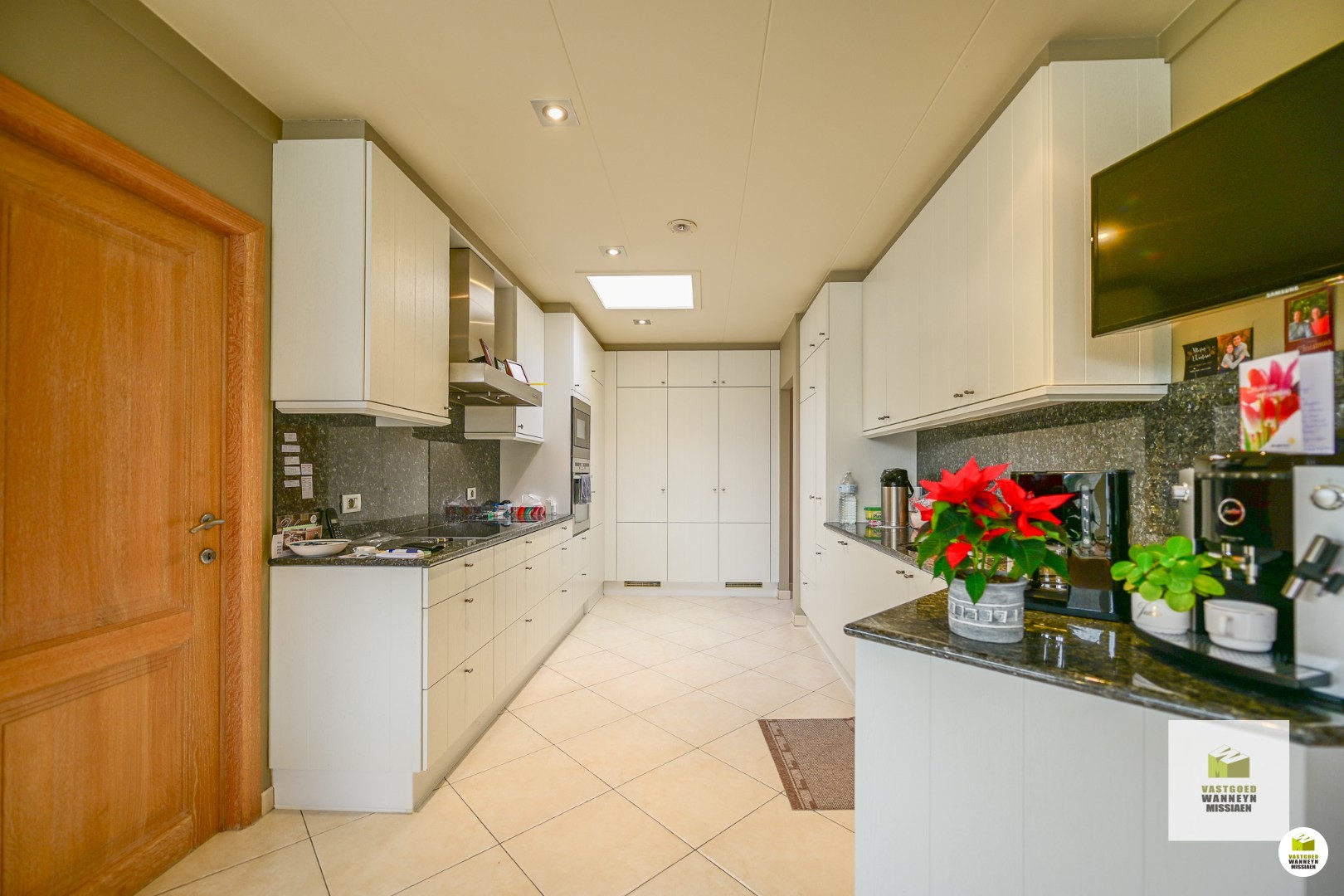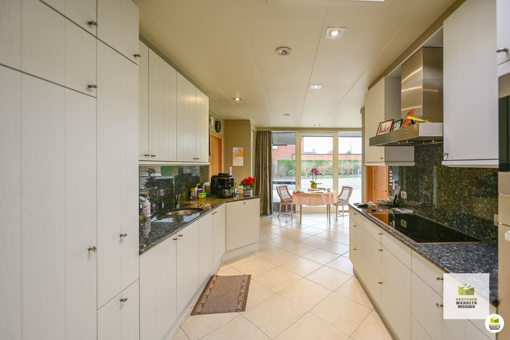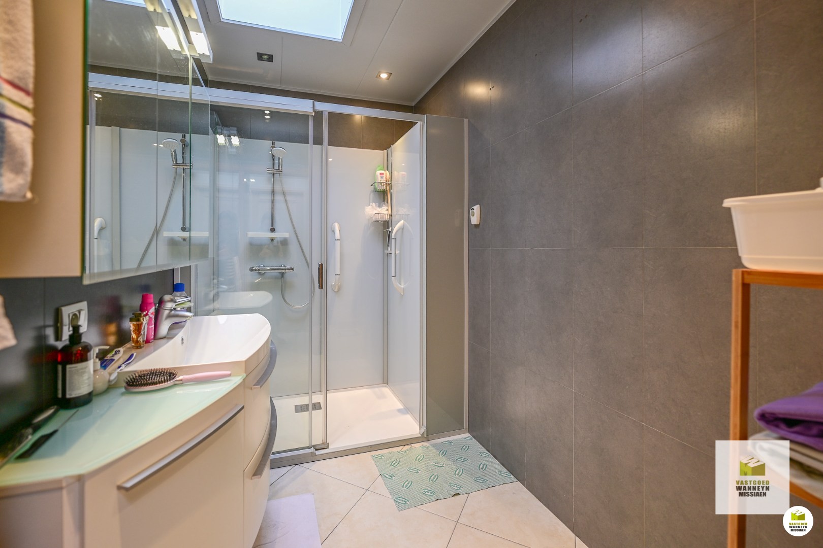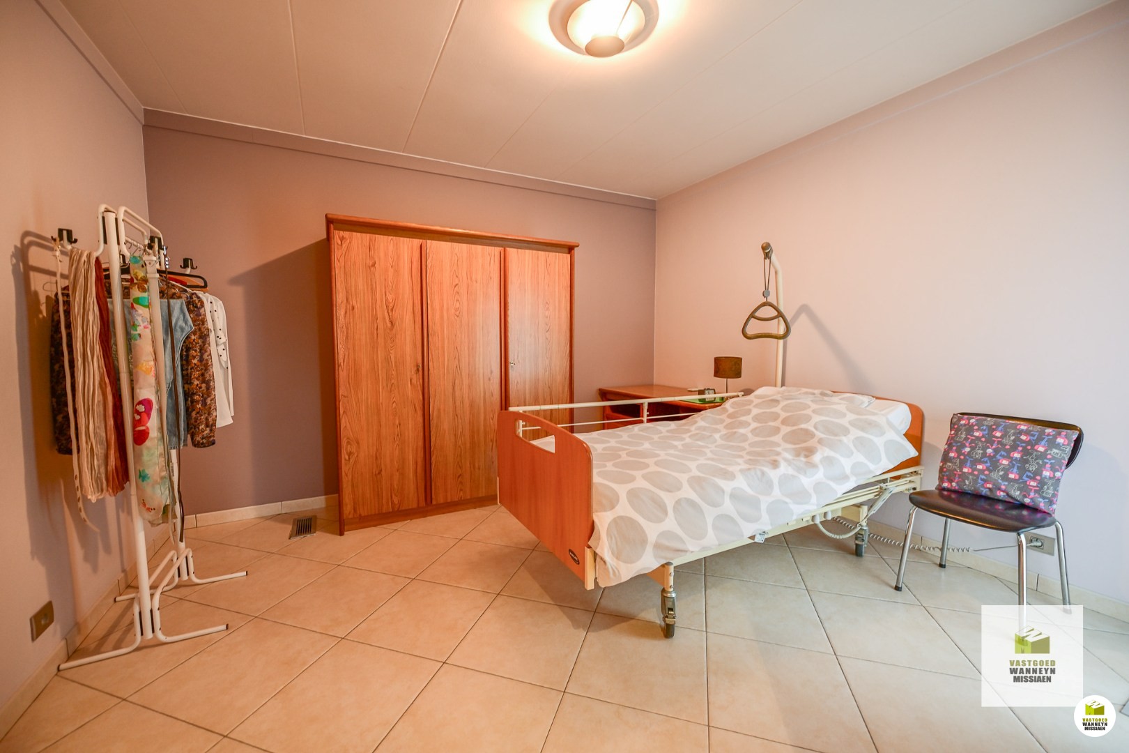 Indeling: inkomhal, woonkamer met op maat gemaakte aardgascasette/TV meubel, lichtrijke eetplaats die de zithoek verbindt met de keuken. Ingerichte keuken met granieten werkblad en berging. Op de nachthal zijn er 2 grote slaapkamers, een badkamer ingericht met inloopdouche en een apart toilet. Tevens is er de toegang vanuit de hal naar het aparte bureel (50m2). Daardoor ook interessant voor een zelfstandige, gezien de ruimte een aparte inkom heeft en voldoende ruimte biedt voor een bureau- of ontvangstruimte, nagelstudio, kapperszaak ect. Deze ruimte werd gebouwd destijds met als doel een familielid te kunnen laten inwonen. (zorg/kangoeroewoning). Er is ook nog een huisbureau of speelruimte met inbouwkasten nabij de keuken en een aparte wasplaats.