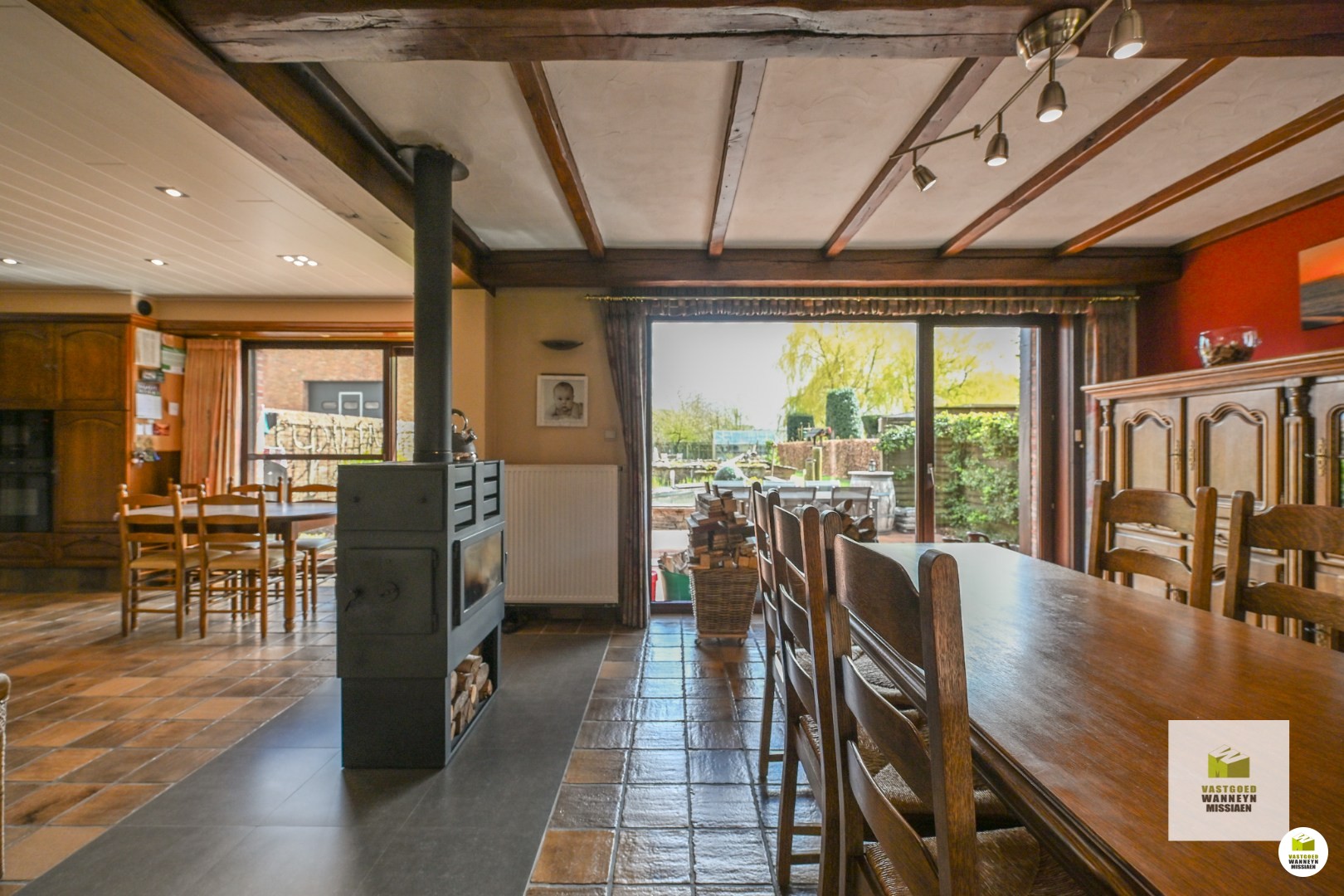 Indeling van de woning: binnenkomen in de ruime en open inkomhal, hier is meteen ook toegang tot de eerste gelijkvloerse slaapkamer, deze grenst aan de douchekamer die later aan bod komt. Onder de trap is de deur naar de droge kelder. Vervolgens komen we in de leefruimte binnen met de aparte zithoek en eetplaats, gescheiden door een open haard. Palend hieraan is de open keuken gelegen, tevens uitgerust met een extra eetplaats. Ook van hieruit is toegang ... tot het terras en de tuin. Deze ruimtes worden verwarmd met een charmante houtkachel. Vervolgens is er nog een apart toilet, wasplaats met doucheruimte en berging gelegen. Boven zijn nog 3 ruime en volwaardige slaapkamers, alsook een badkamer met ligbad, lavabo en toilet;