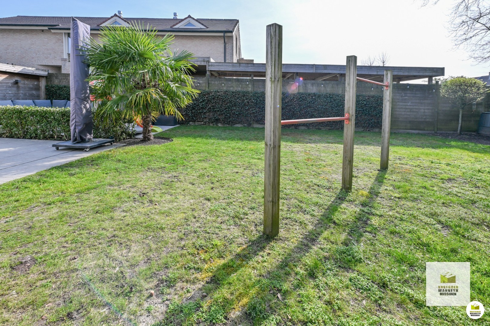 Via de inkomhal met gastentoilet bereik je ook het kantoor. De leefruimte is praktisch en gezellig ingedeeld, met een aparte speelkamer 17m2 (of slaapkamer op het gelijkvloers) voorzien van inbouwkasten, een knusse tv-hoek met houtcassette en een lichtrijke eetplaats die aansluit op een volledig ingerichte keuken.