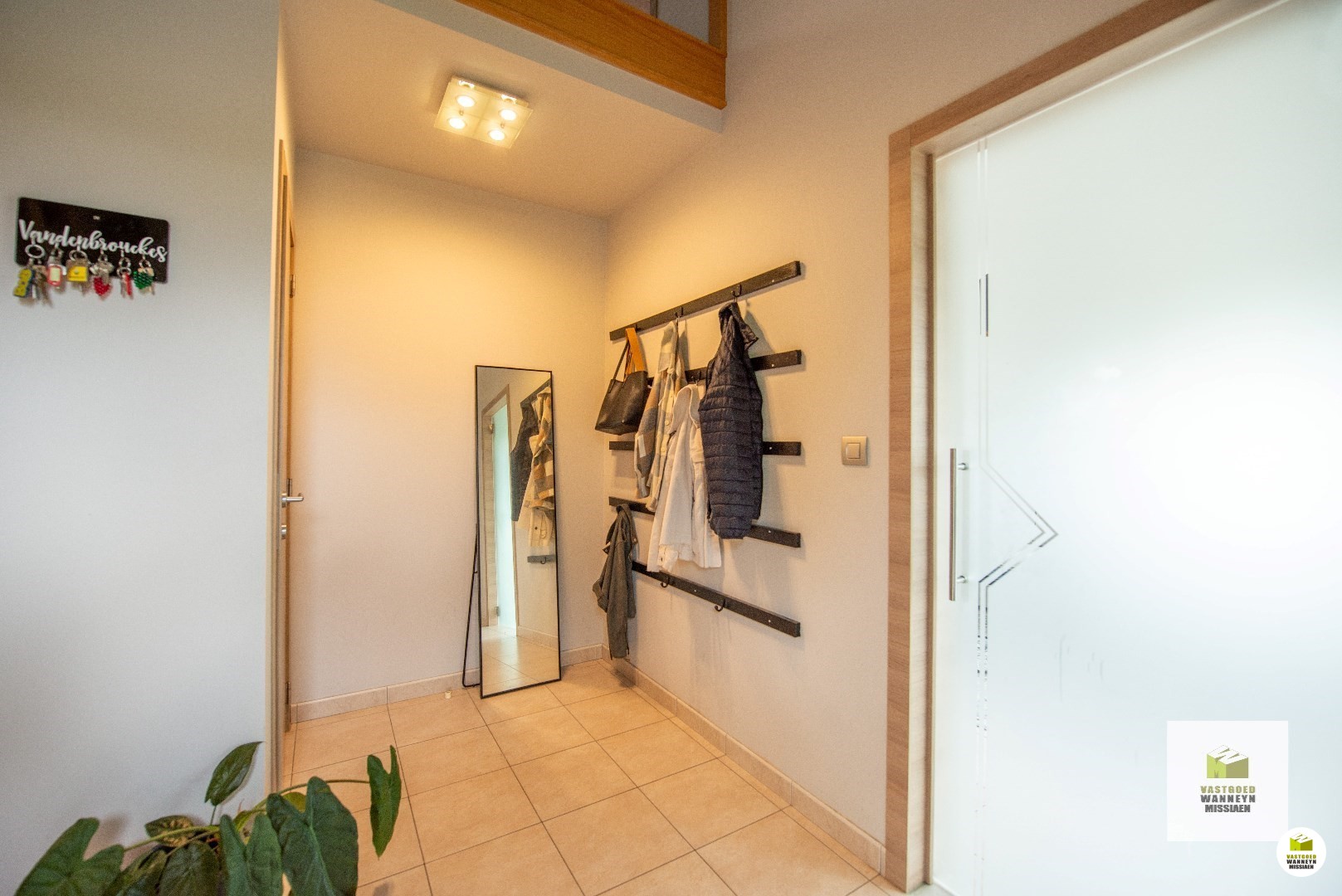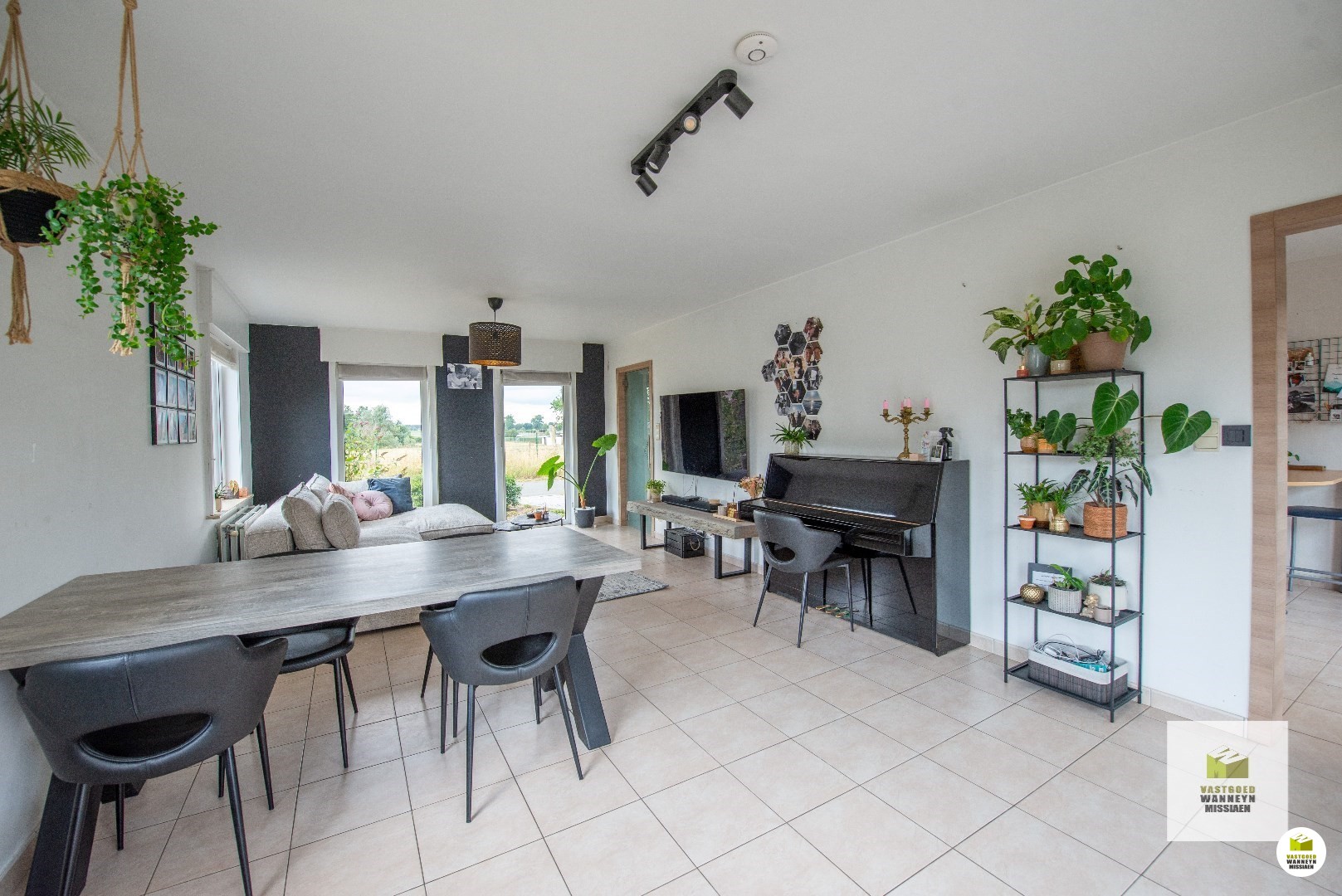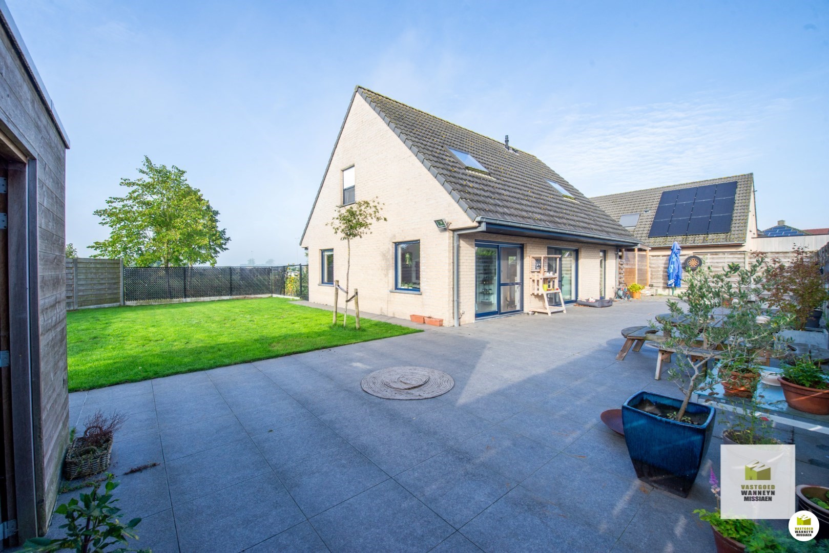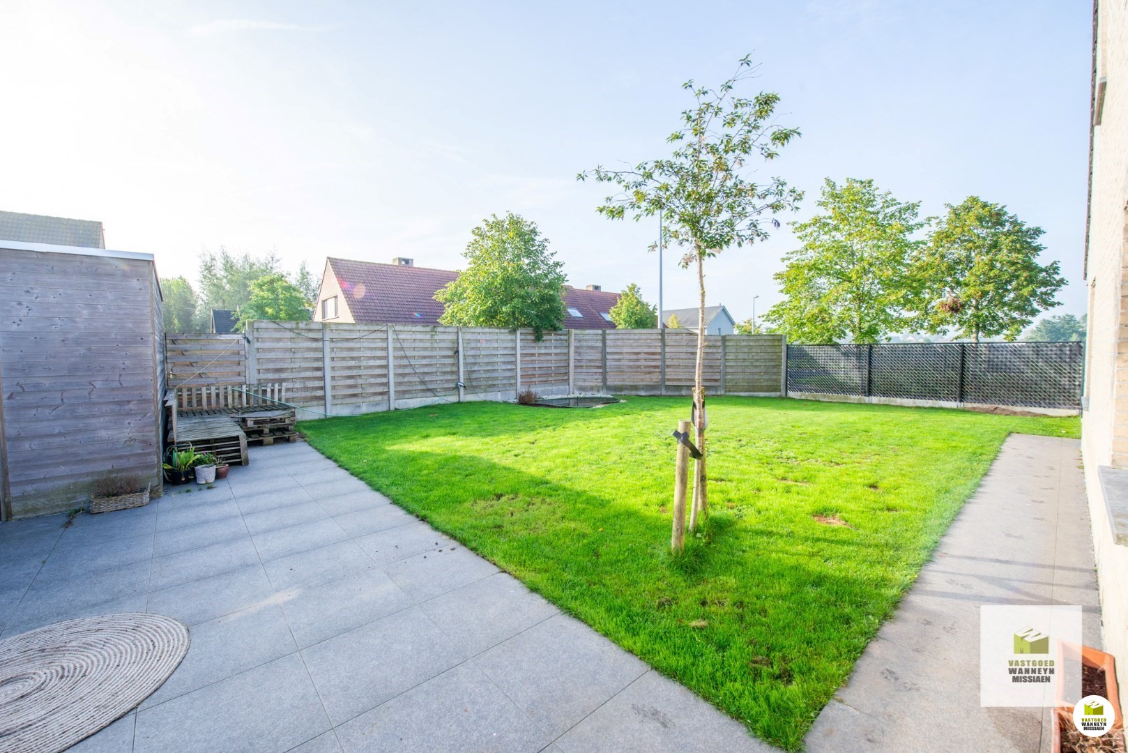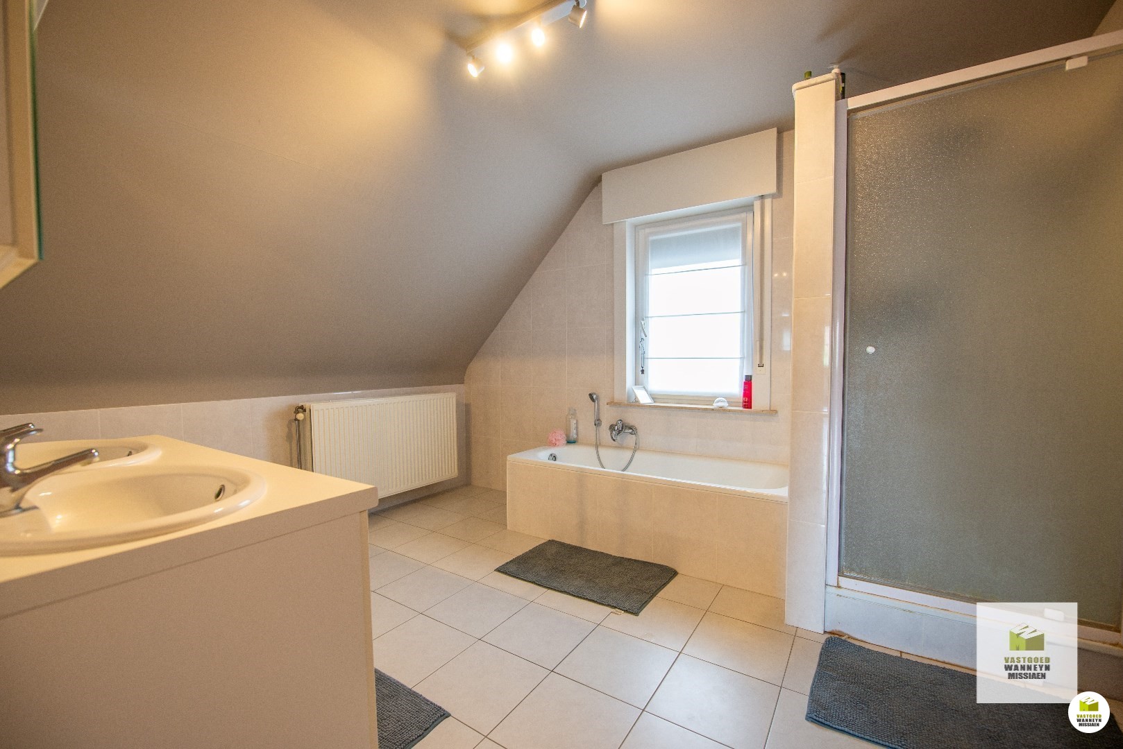 Indeling: Inkomhal met vestiaire hoek en verzorgd gastentoilet. Binnenkomen doen we via de glazen deur. We hebben uitzicht vanuit de zit- en eethoek op de tuin en het groot terras maar ook op de ver uitgestrekte velden. De keuken is volledig ingericht en bevindt zich vlak naast de berging/garage en achterdeur. Je kan gemakkelijk met een 4-tal personen eten in de keuken. Fijn is ook het schuifvenster naar het groot terras met bijhorende vliegramen. Op de ... eerste verdieping vinden we een badkamer ingericht met ligbad én douche, dubbele lavabo en apart toilet. Er zijn 3 ruime slaapkamers die voorzien zijn van manuele rolluiken. In de tuin is er een praktische en verrassend ruime geïsoleerde tuinberging. Er is ook een poortje aan de zijkant, gemakkelijk voor iemand die bijvoorbeeld graag gaat fietsen. In de tuin zijn er verschillende leuke plekken waar je de zon en de schaduw kunt opzoeken.