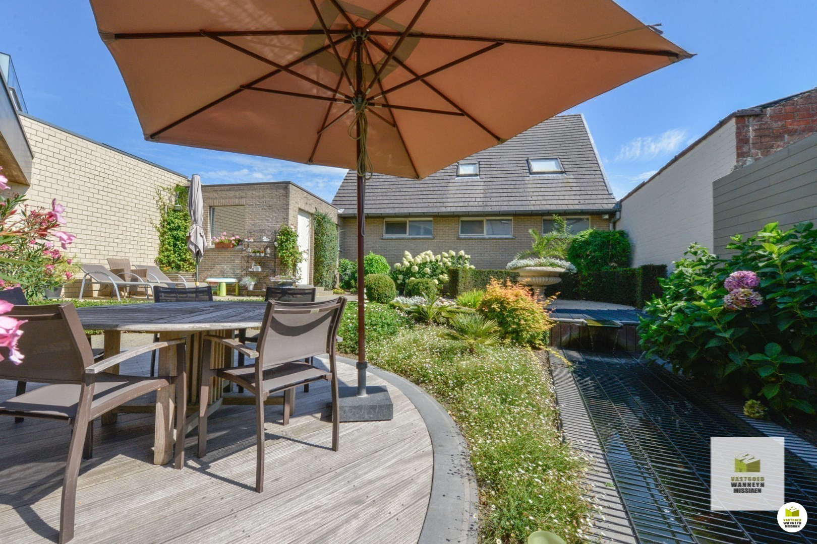 De tuin is zongericht met een vijver en fonteintje en verschillende terrasjes, daardoor echt wel onderhoudsvriendelijk.